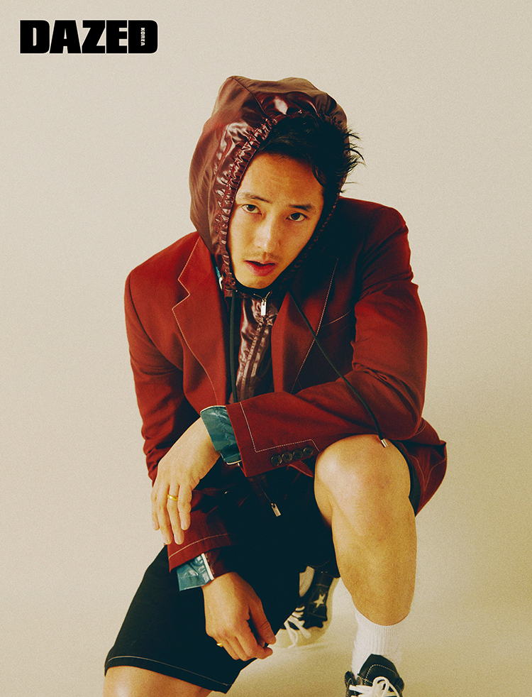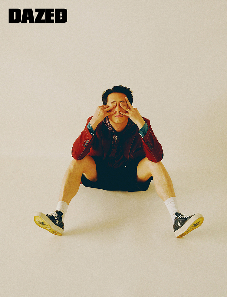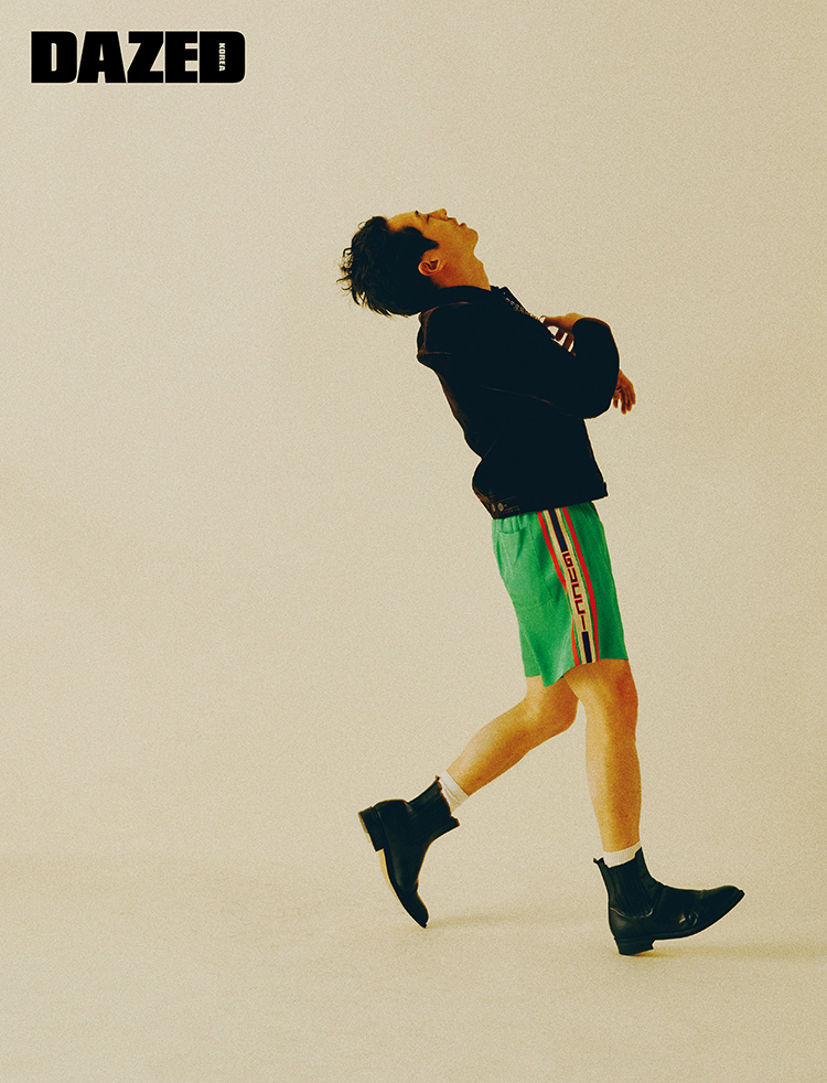 벨벳 재킷과 앵클부츠는 김서룡(Kimseoryong), 네온 컬러 트렁크 쇼츠는 구찌(Gucci)