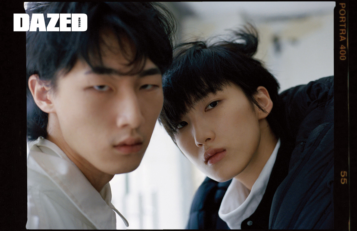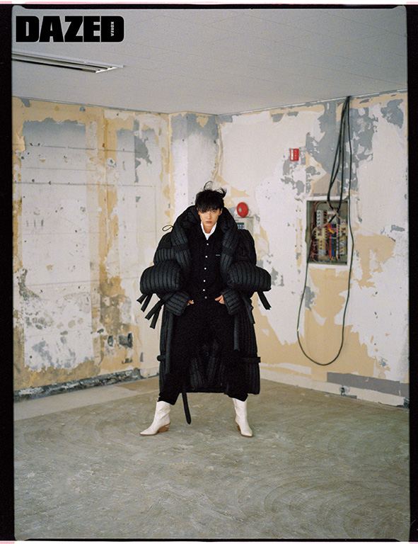로프와 스펀지 장식 패딩 코트는 몽클레르 X 크렉 그린(Moncler X Craig Green), 데님 셔츠와 팬츠, 터틀넥은 모두 캘빈 클라인 진(Calvin Klein Jeans), 레더 부츠는 펜디(Fendi).