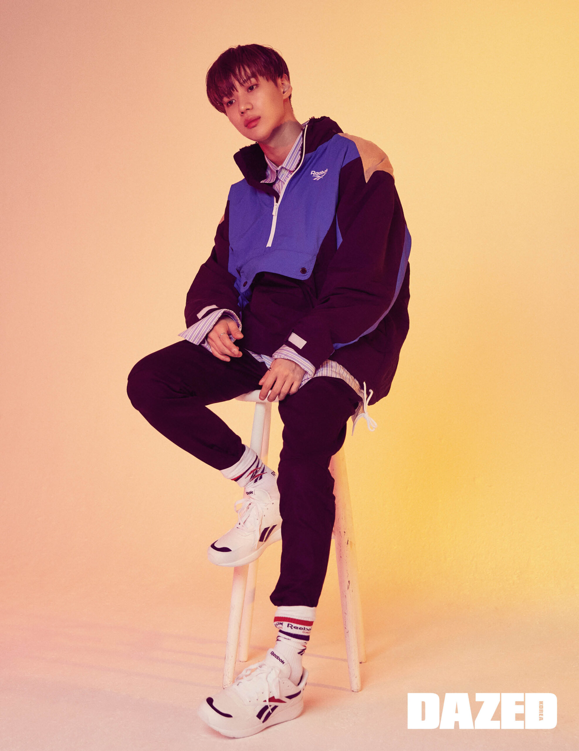 레트로 컬러 배합이 눈에 띄는 아노락 점퍼는 리복 클래식(Rebook Classic), 줄무늬 셔츠는 에디터의 것, 팬츠는 스티그마(Stigma), 로고 양말과 운동화 대쉬오닉은 리복 클래식(Rebook Classic).