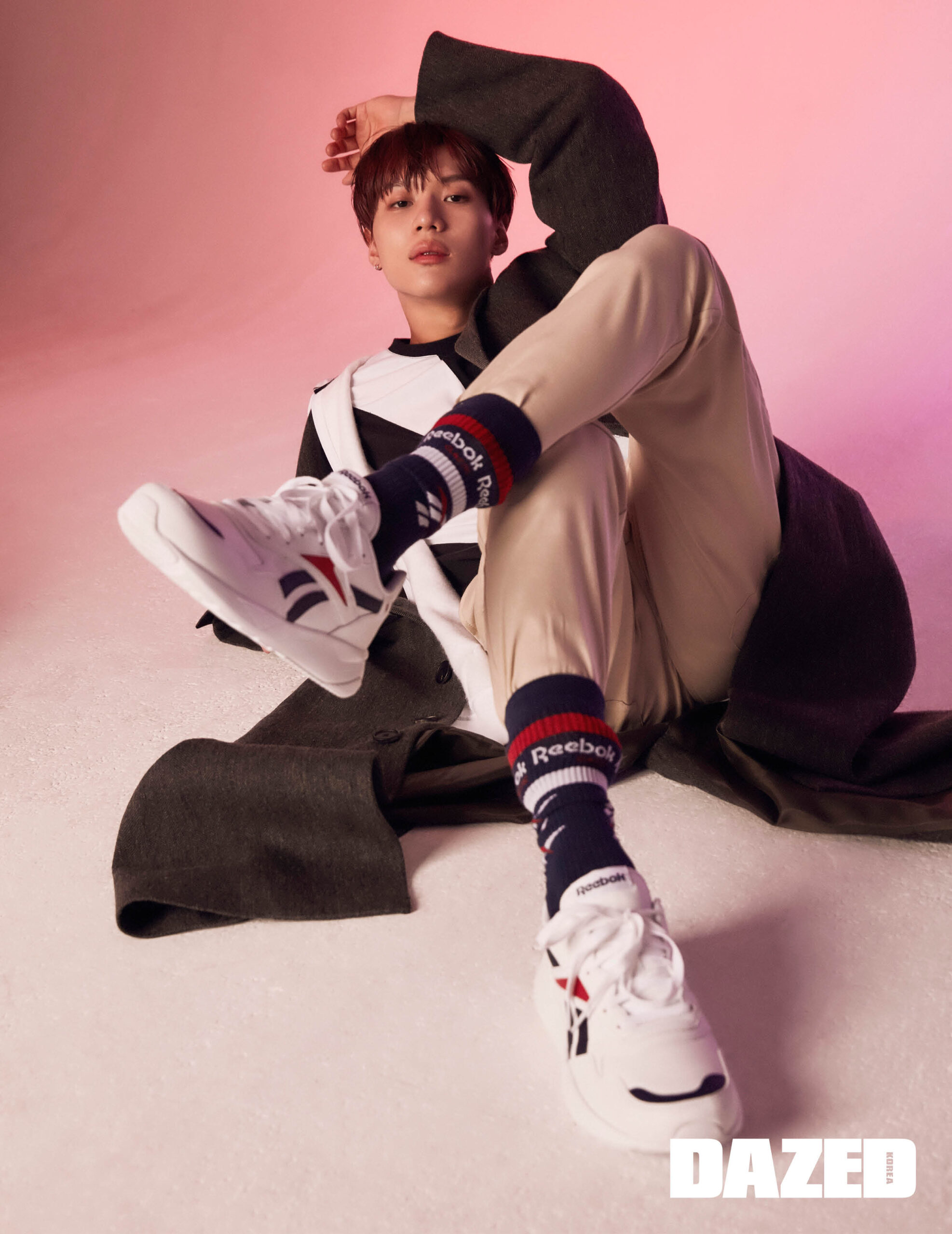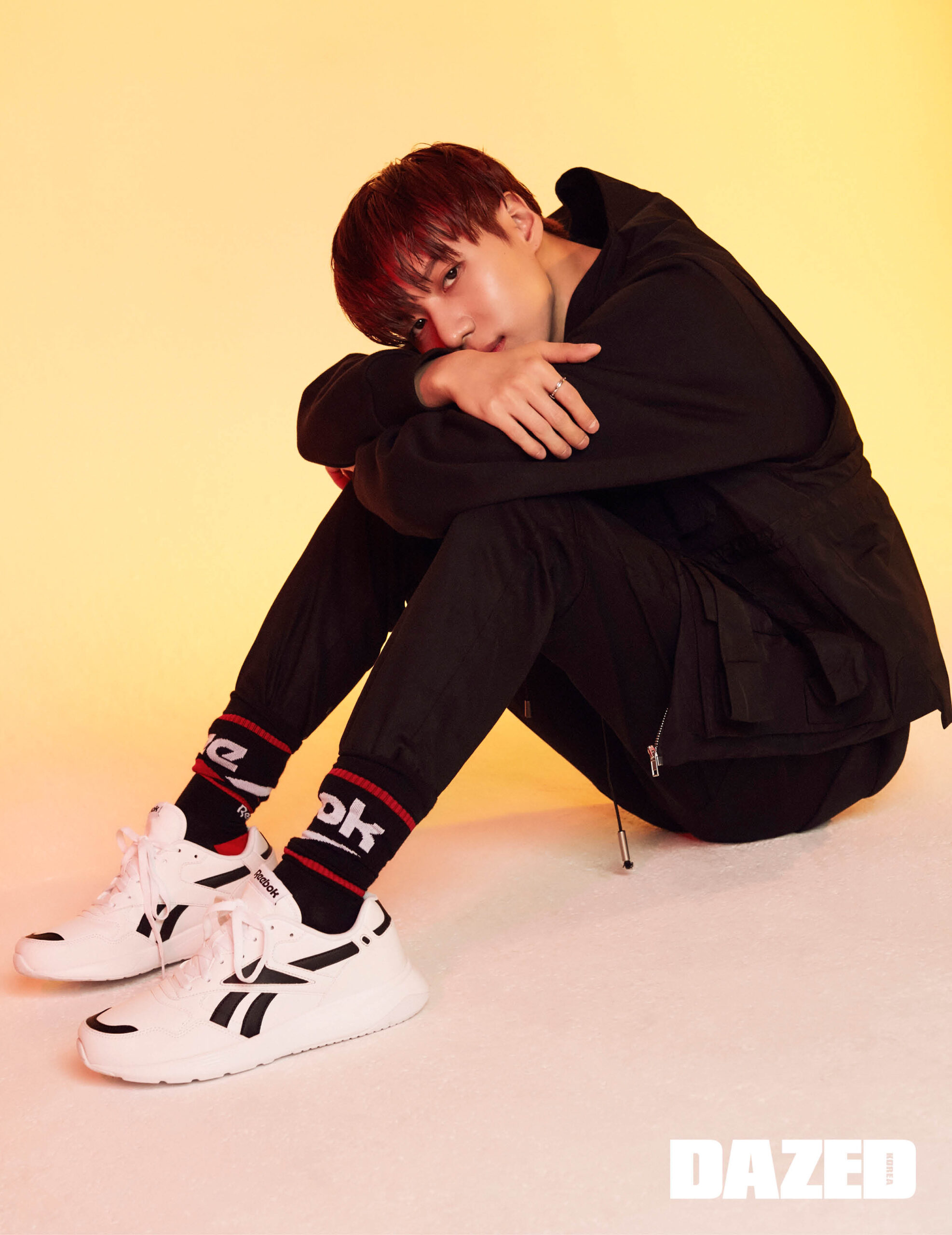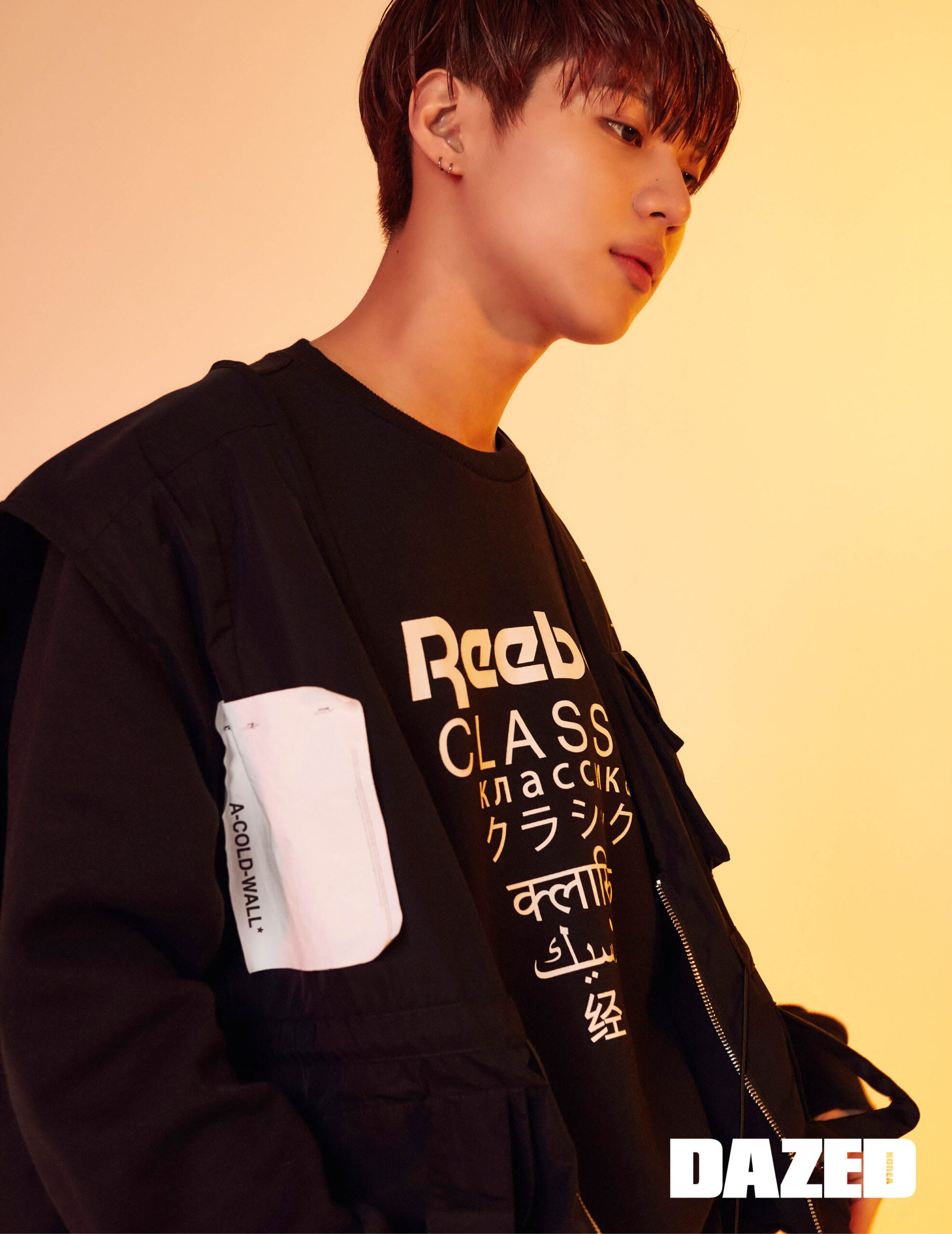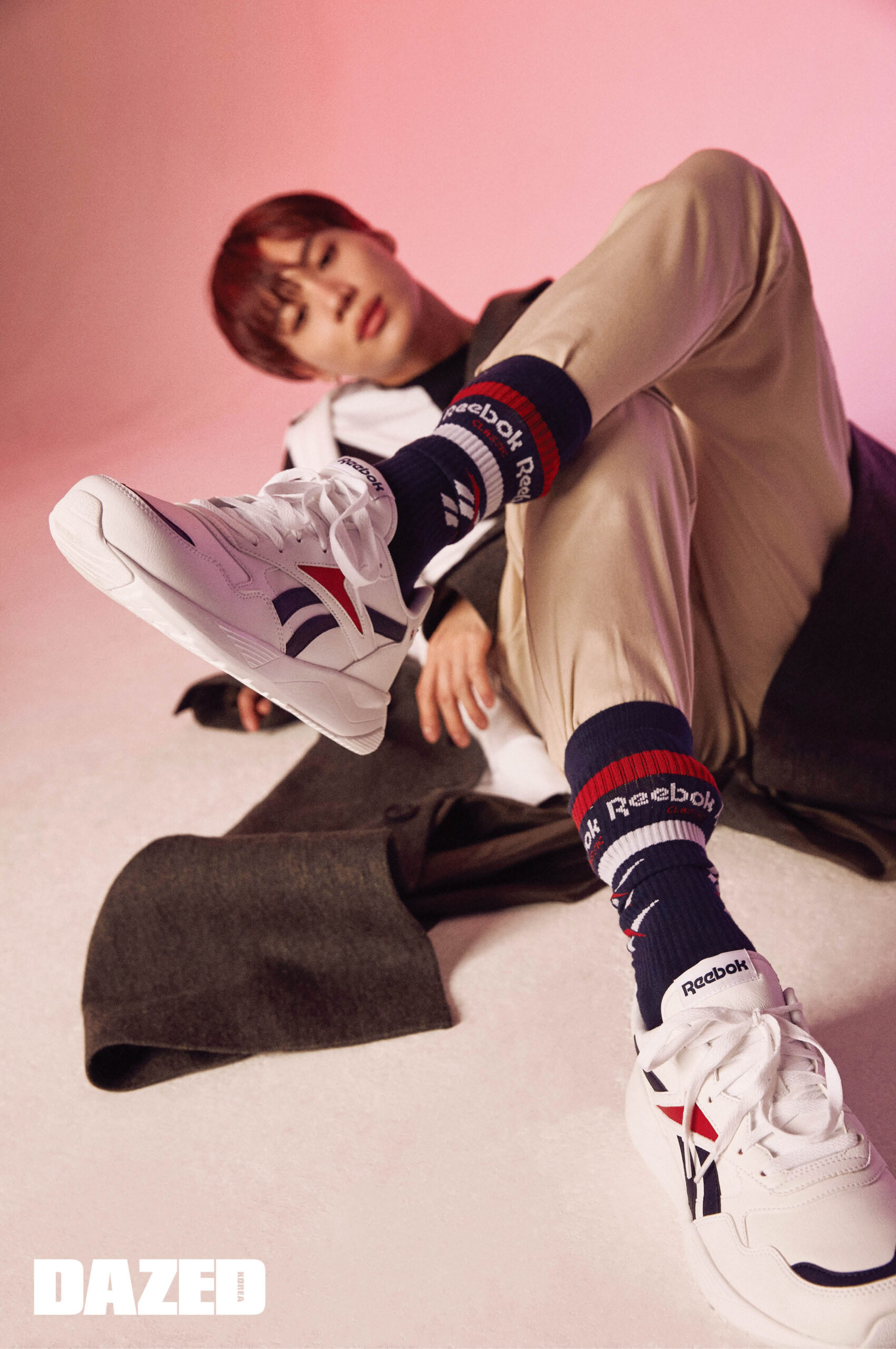 리복을 다양한 언어로 표기한 스웨트셔츠, 로고 양말, 레트로 무드를 더한 운동화 대쉬오닉은 모두 리복 클래식(Rebook Classic), 베스트는 어콜드월 by 분더샵(A-Cold-Wall by BOONTHESHOP), 팬츠는 스티그마(Stigma).