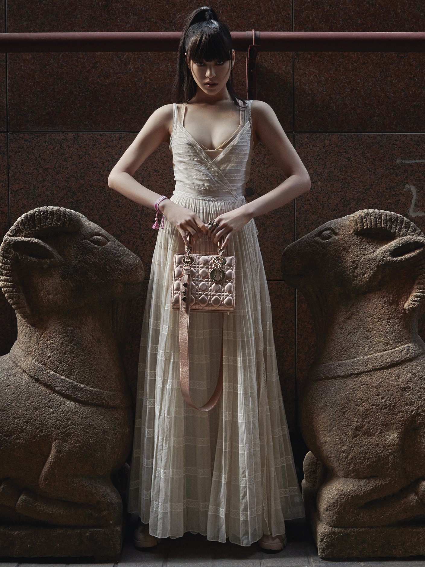 레드 다운 점퍼와 스니커즈는 질스튜어트 스포츠(Jillstuart Sport), 화이트 티어드 스커트는 르메르 by 노비아(Lemere by Novia).