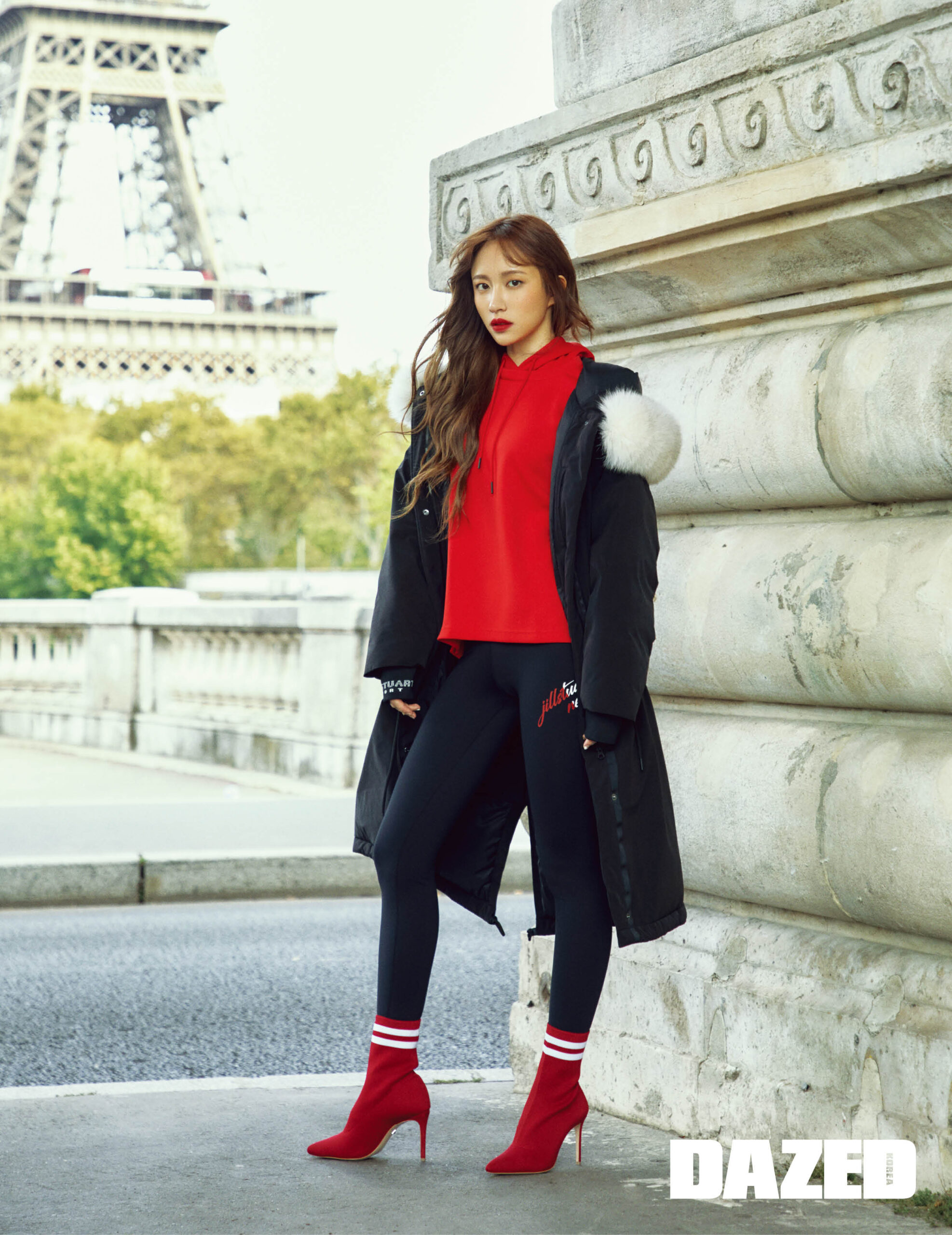 섀도 폭스 퍼 후드 디테일의 오버사이즈 구스 다운 야상 재킷과 이너로 입은 캐주얼한 스포티형 레드 후드 톱, 레드 레터링 포인트의 스포츠 레깅스는 모두 질스튜어트 스포츠(Jillstuart Sport), 레드 삭스 앵클부츠는 지셀라 by 슈츠(Giesela by Schutz).