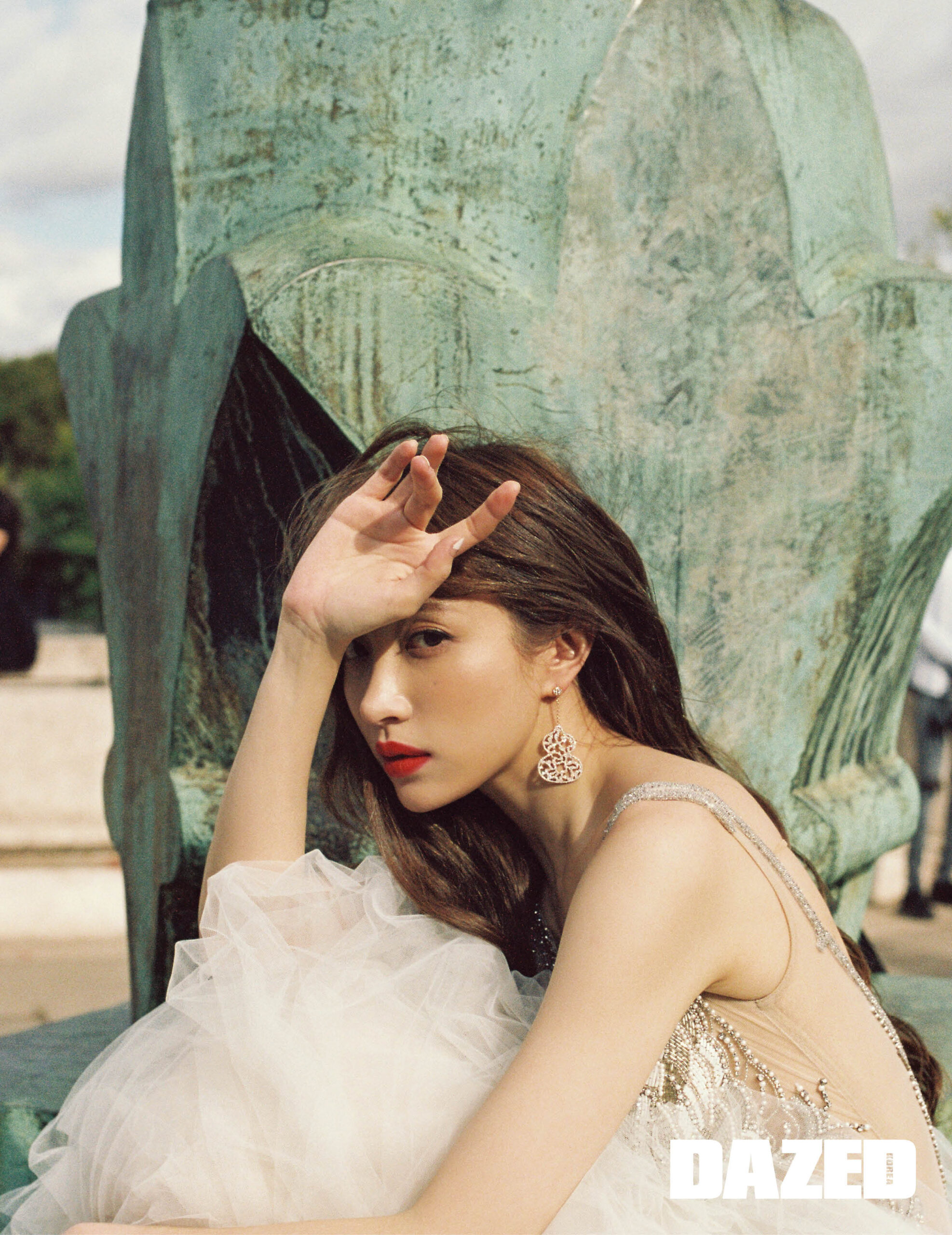 금색 스팽글 장식 드레스는 알론 리바인 by 노비아(Alone Livine by Novia), 드롭 이어링은 키린(Qeelin).