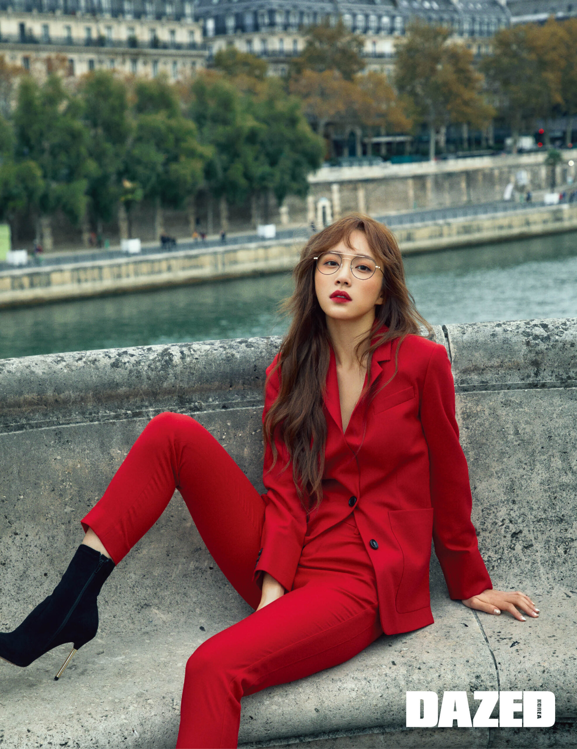 투브릿지 디자인의 아이웨어는 세컨드라운드 아이웨어(SNRD Eyewear), 미니멀한 실루엣의 레드 수트 재킷, 팬츠는 알에스나인서울(RS9Seoul), 블랙 앵클 부츠는 알도(Aldo).