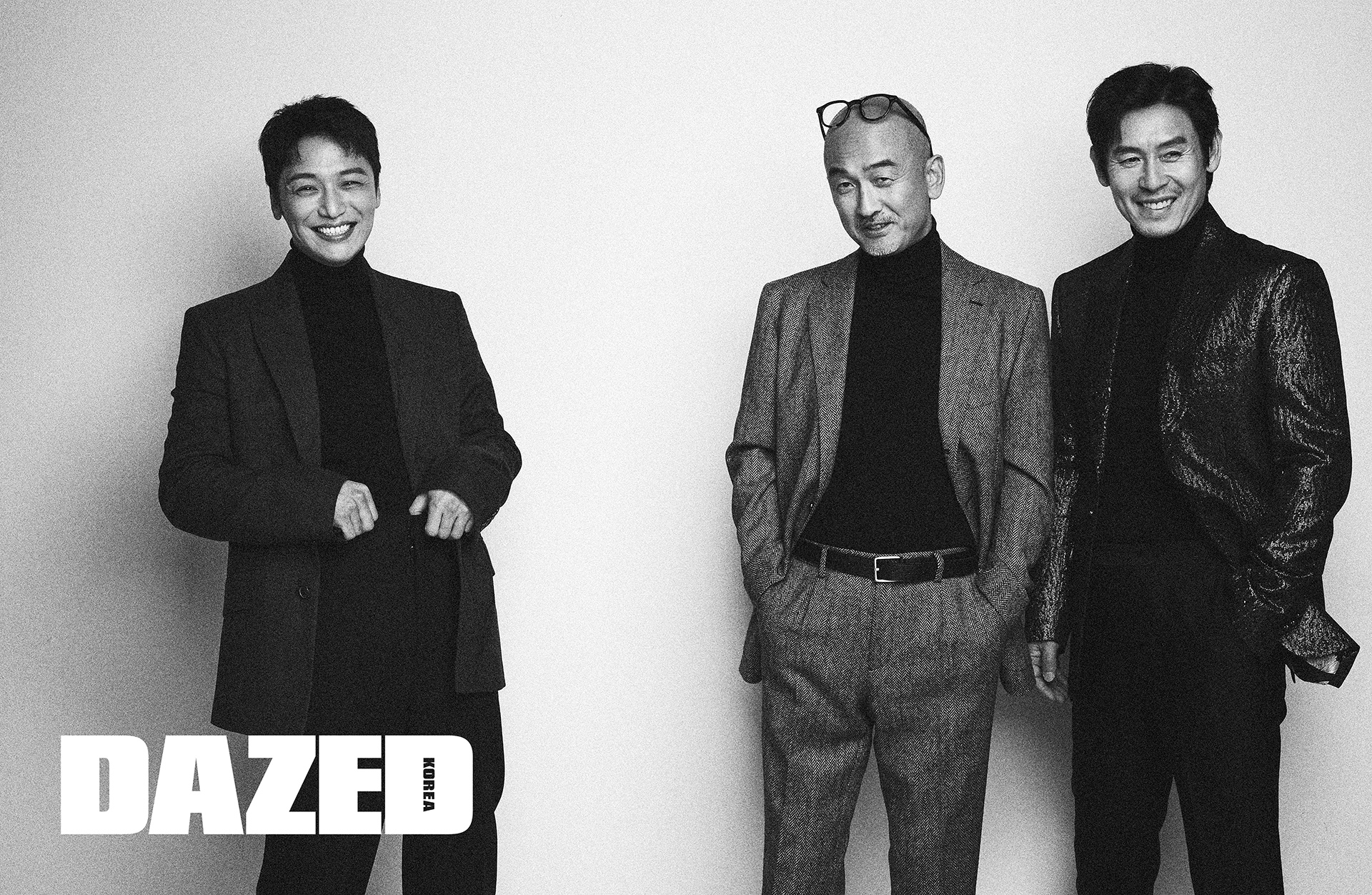 요한이 입은 엠브로이더리 디테일 재킷은 로샤스 by 분더샵(Rochas by BOONTHESHOP), 터틀넥 톱과 와이드 팬츠는 스타일리스트의 것. 준익이 입은 헤링본 슈트는 맨온더분(Man On The Boon), 터틀넥 톱과 벨트는 스타일리스트의 것. 경구가 입은 자카르 재킷과 팬츠는 로드앤테일러(Lord And Taylor), 터틀넥 톱은 스타일리스트의 것.
