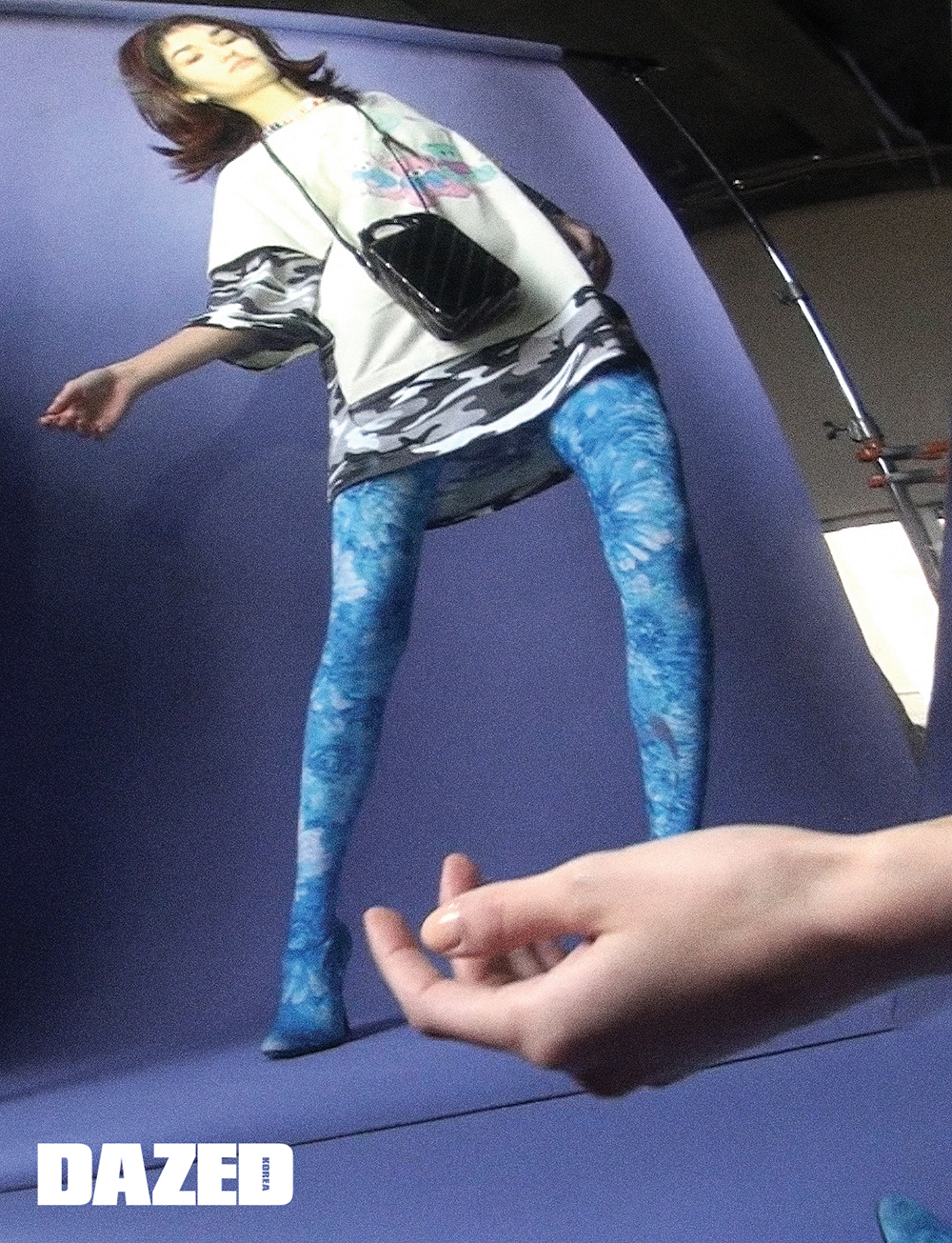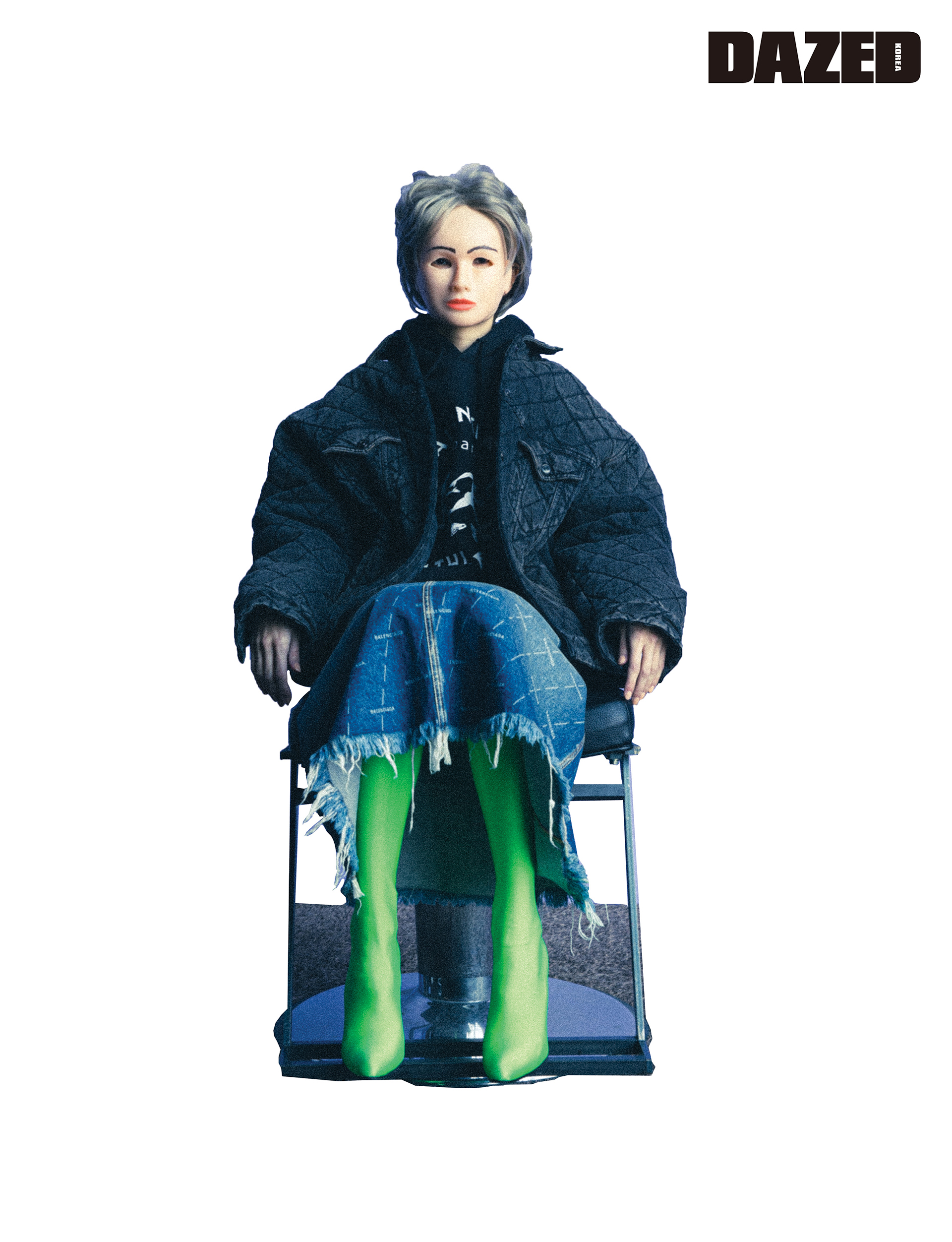 보머 후디와 데님 스커트, 블루 팬타 레깅스 슈즈는 모두 발렌시아가(Balenciaga).