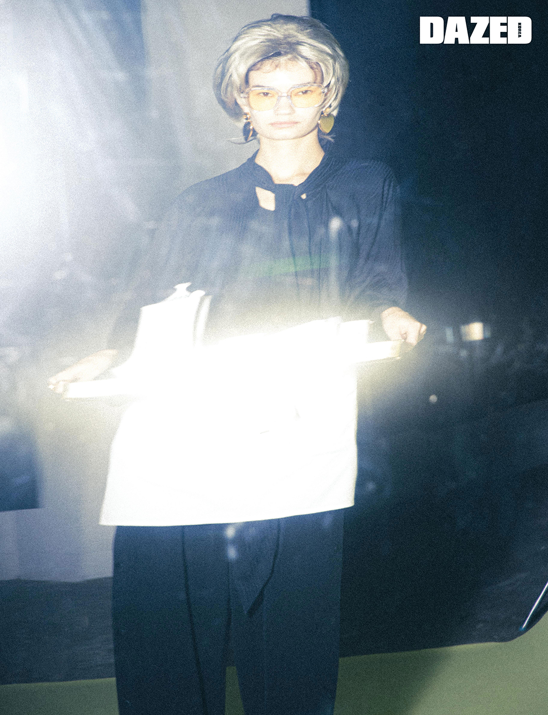 블랙 스카프 셔츠와 스냅 팬츠, 골드 이어링은 모두 발렌시아가(Balenciaga), 틴트 렌즈 선글라스는 플럼(Plume).