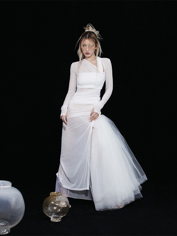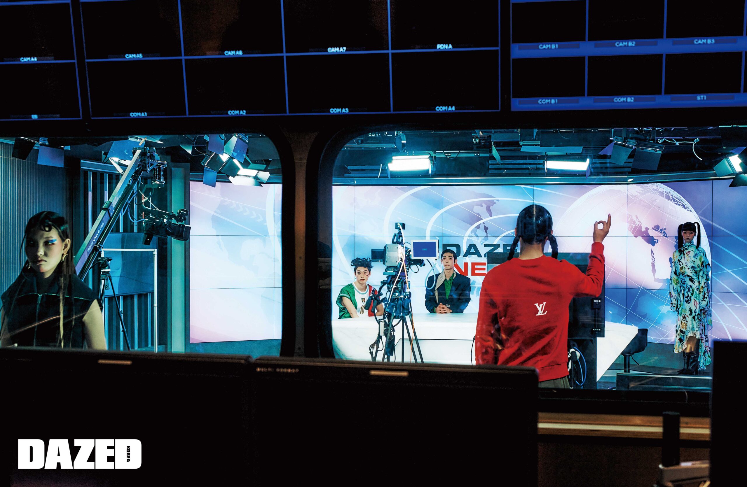 평화가 입은 블랙 슬리브리스 재킷과 이어링은 지방시(Givenchy). 승희가 입은 복서 톱은 돌체앤가바나(Dolce&Gabbana). 태양이 입은 블랙 롱 코트는 루이 비통(Louis Vuitton), 그린 오버핏 셔츠와 이너로 착용한 롱 칼라 셔츠는 발렌티노(Valentino). 영훈이 입은 레드 맨투맨과 카키 스커트는 루이 비통(Louis Vuitton). 주영이 입은 드로잉 패턴의 트위스트 드레스와 블랙 니하이 부츠는 발렌시아가(Balenciaga).