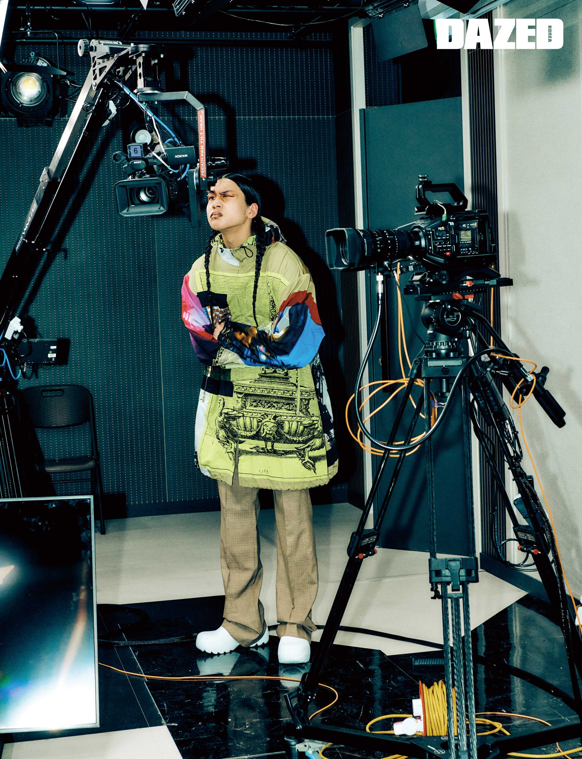 콜라주 프린트의 윈드브레이커와 브라운 체크 팬츠는 드리스 반 노튼 by 분더샵 (Dries Van Noten by BOOTHERSHOP), 화이트 러버 뮬은 보테가 베네타(Bottega Veneta), 피어싱은 에디터의 것.