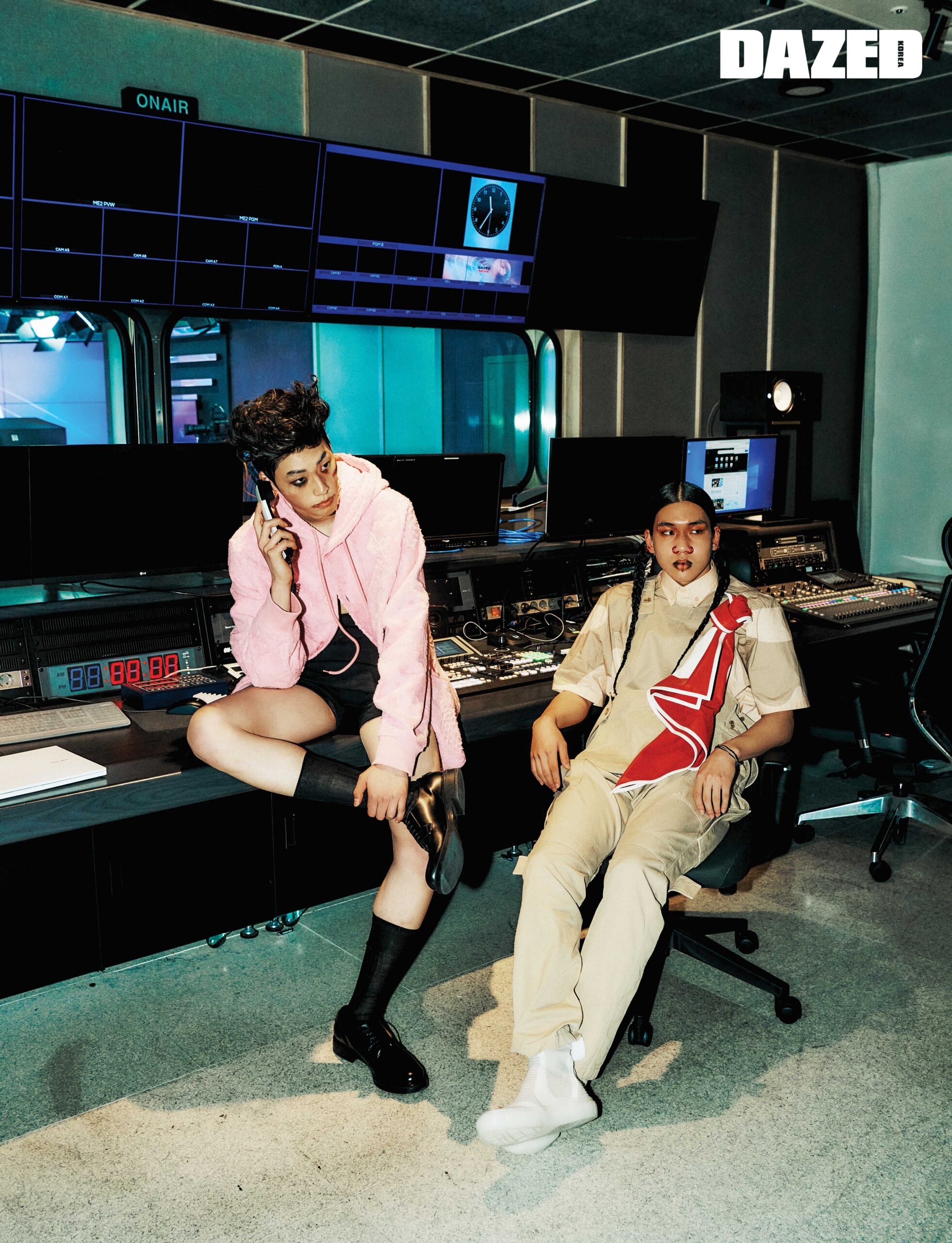 승희가 입은 테라 소재의 핑크 후디와 블랙 쇼츠, 블랙 레이스업 슈즈, 블랙 울 삭스는 모두 프라다(Prada). 영훈이 입은 허니 컬러 오버올과 허니 컬러 셔츠, 화이트 스니커즈, 어깨에 묶은 레더 스카프, 핑크 컬러 노즈 브리지와 노즈 피어싱, 립 커프, 피어싱 링은 모두 버버리(Burberry), 브레이슬릿은 영훈의 것, 아이브로 피어싱은 에디터의 것.