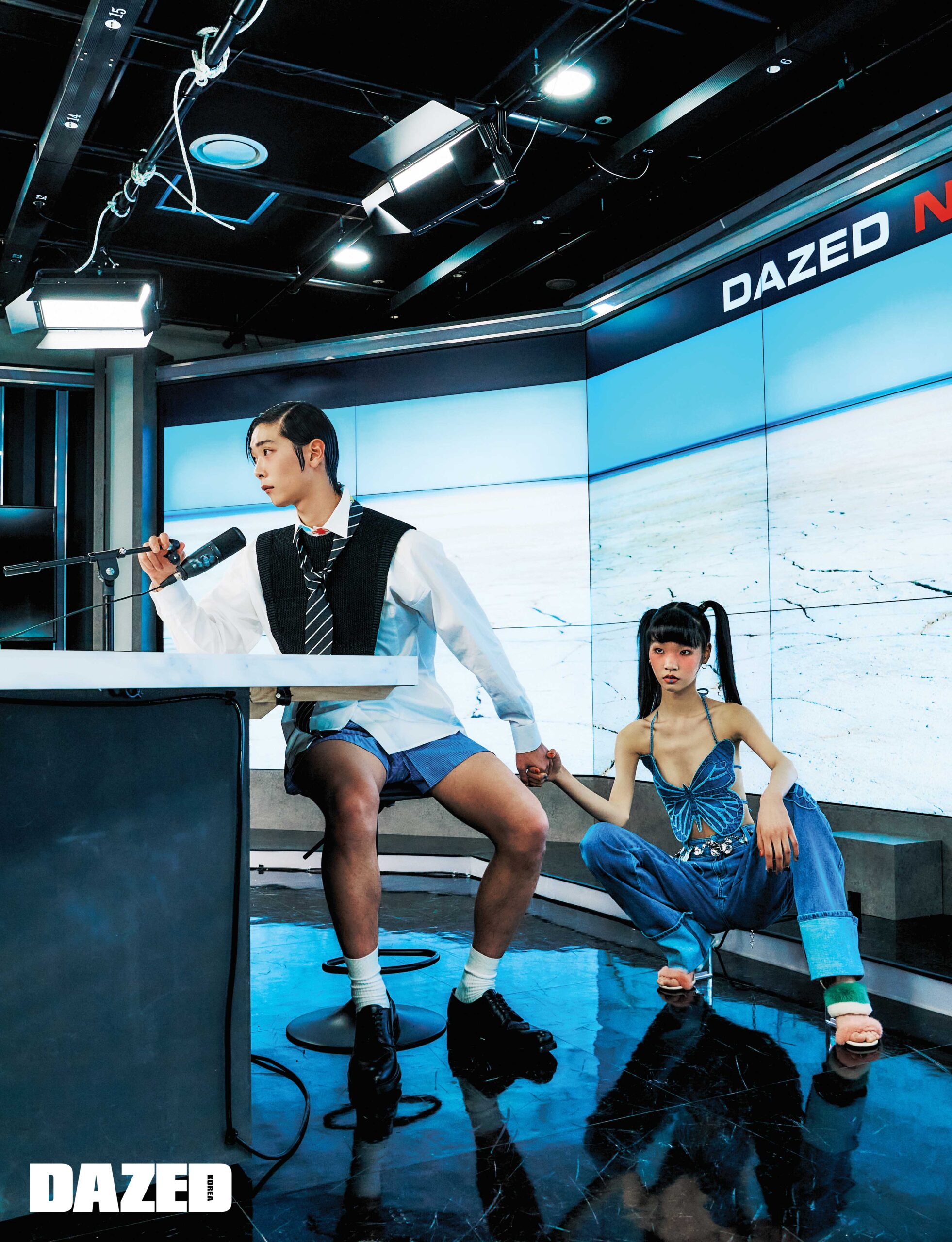 태양이 입은 화이트 셔츠와 블랙 니트 베스트는 살바토레 페라가(Salvatore Ferragamo), 블랙 삼각 로고 레이스업 슈즈는 프라다(Prada), 컬러 네크리스와 스트라이프 패턴 넥타이, 블루 언더웨어와 화이트 삭스는 모두 에디터의 것. 주영이 입은 나비 모양의 데님 톱과 팬츠, 허리에 묶은 나비 모양의 체인 벨트는 모두 블루마린(Blumarine), 퍼 장식 슬링백은 펜디(Fendi), 이어링은 주영의 것.