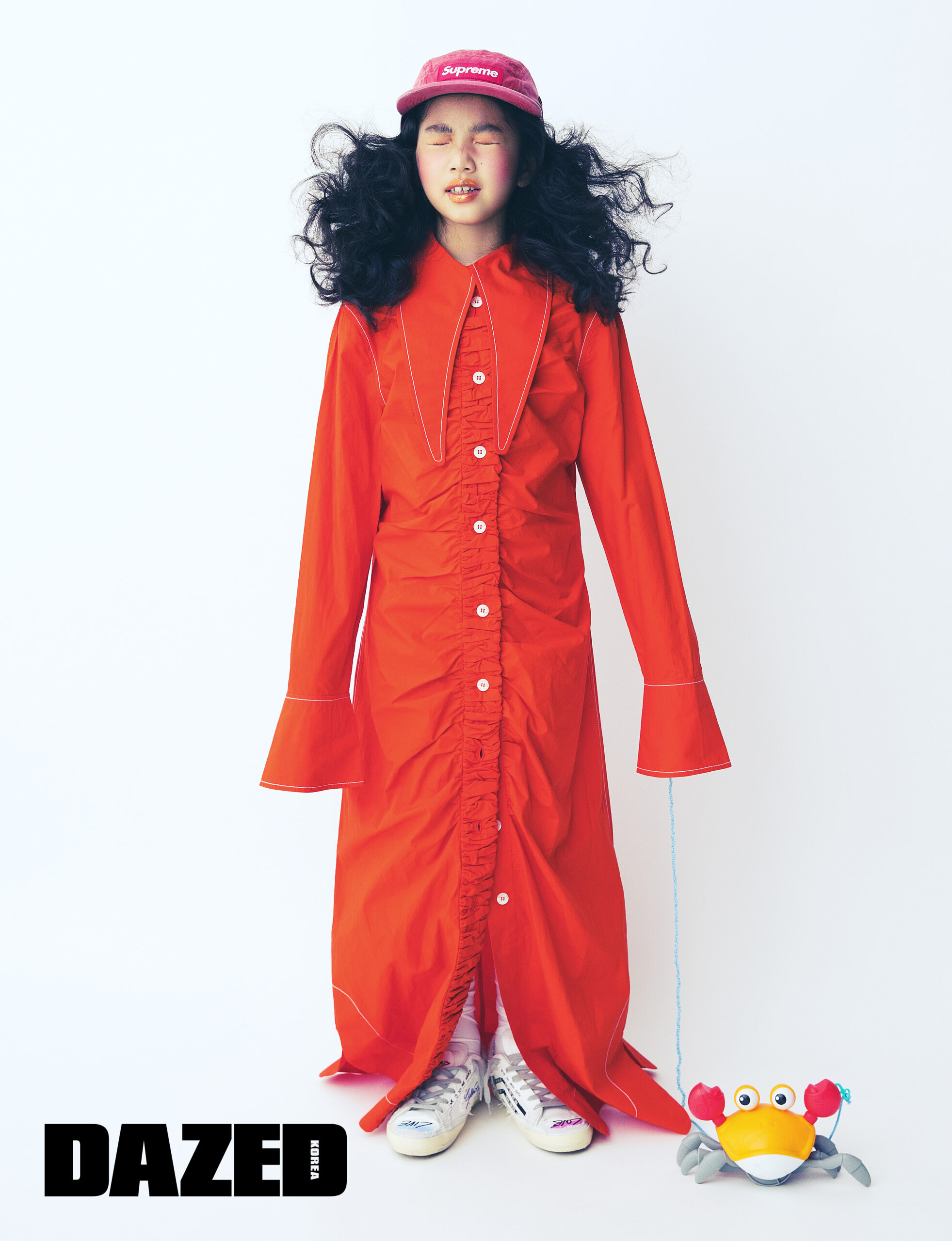 빅 칼라 디테일의 셔링 셔츠 드레스는 가니(Ganni), 빈티지 그라피티 스니커즈는 골든구스(Golden Goose), 삭스와 볼캡은 스타일리스트의 것.