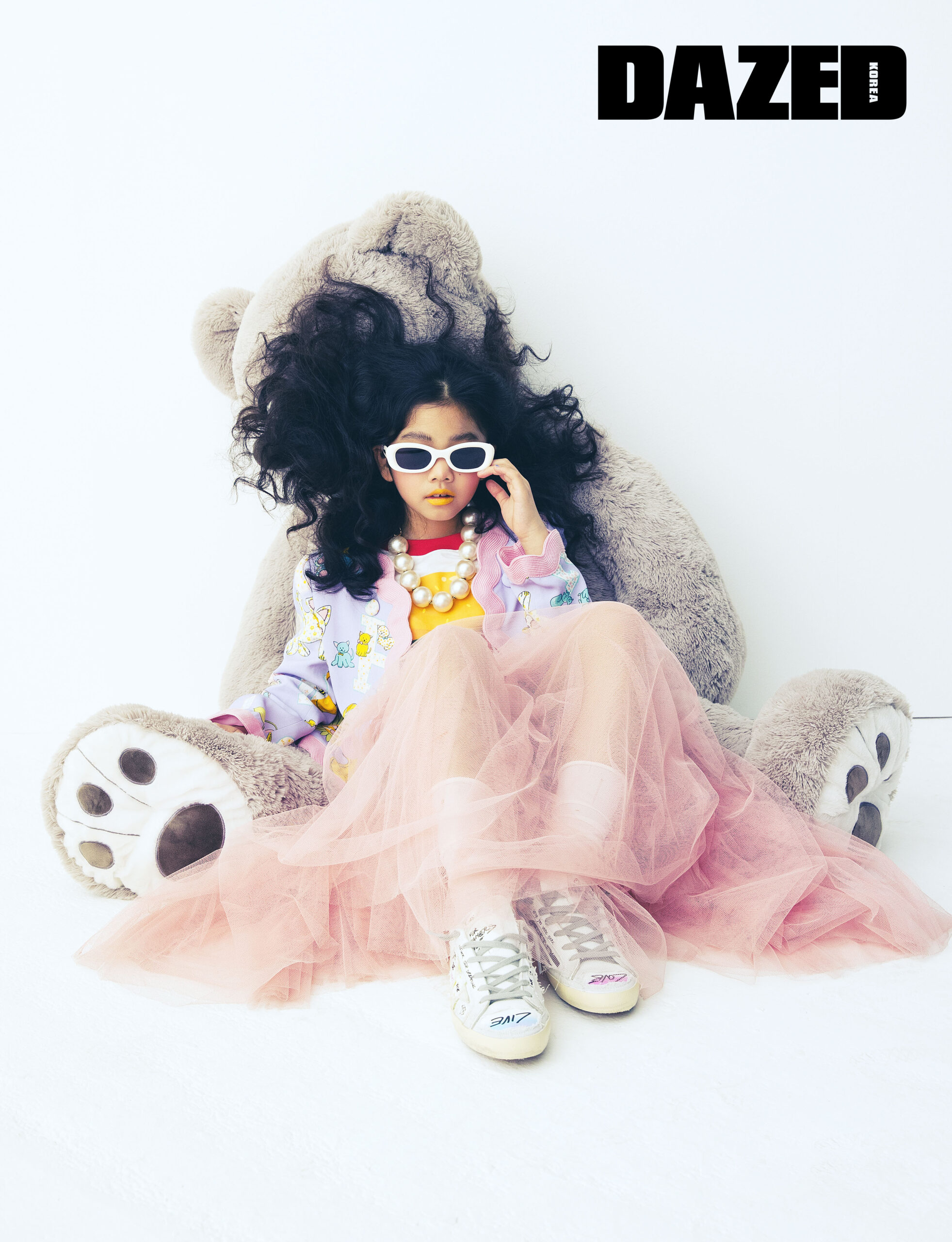 서커스 로고 캔디 재킷과 햄버거 프린트 티셔츠는 모스키노(Moschino), 튈 스커트는 레페토(Repetto), 빈티지 그라피티 스니커즈는 골든구스(Golden Goose), 선글라스는 젠틀 몬스터(Gentle Monster), 펄 네크리스는 돌체앤가바나(Dolce&Gabbana), 삭스는 스타일리스트의 것.