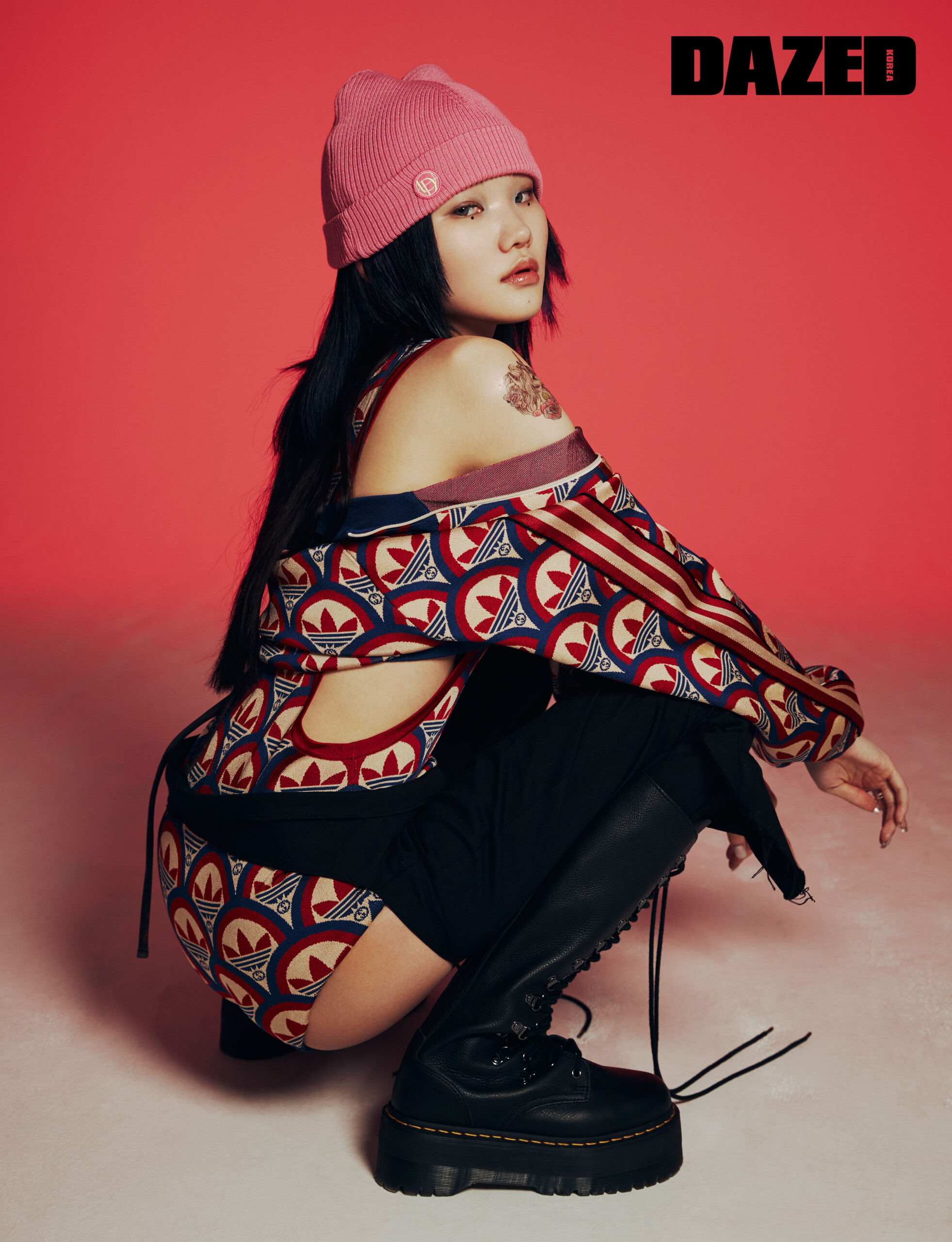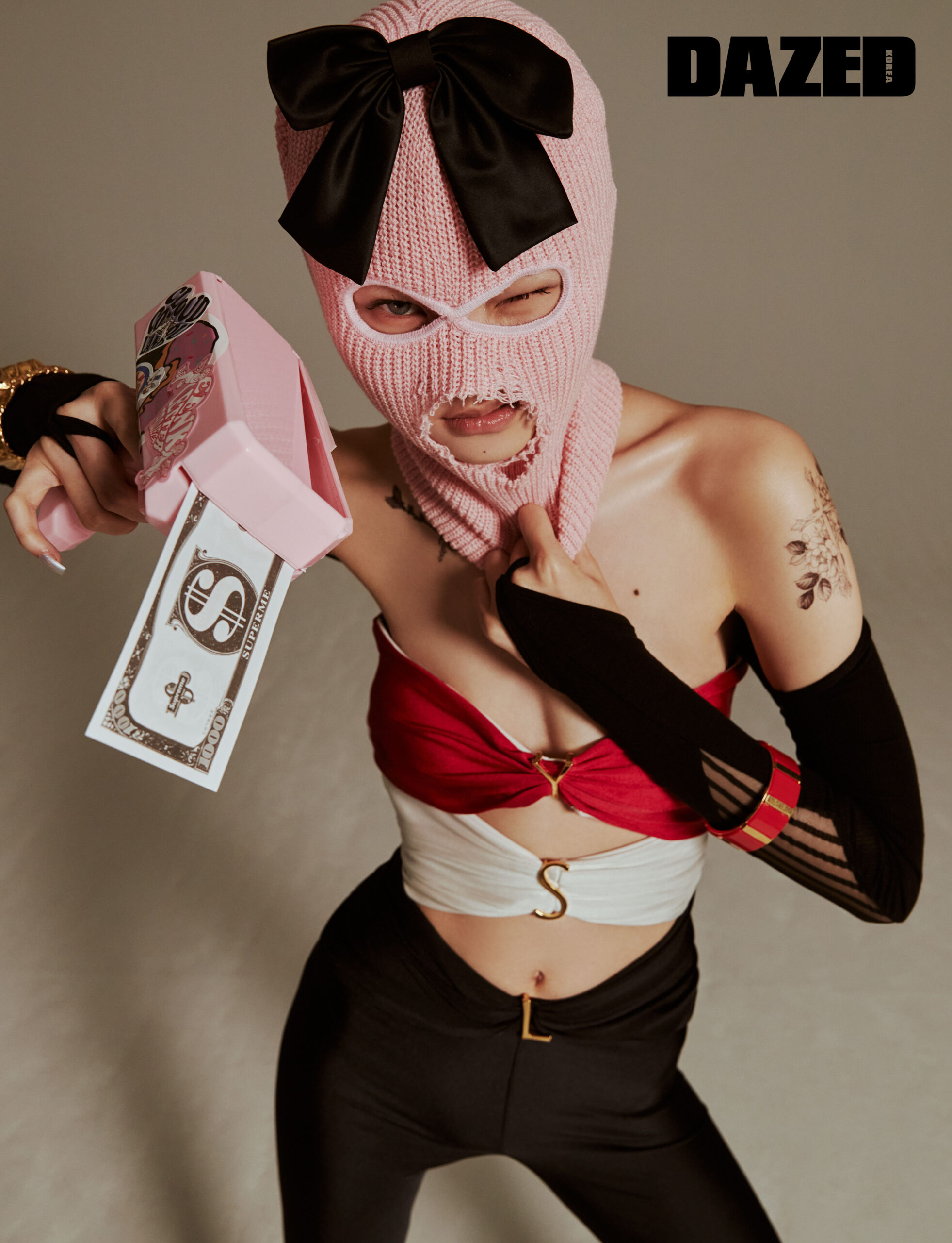 웹 리본 장식의 니트 보머 재킷과 컷아웃 디테일 점프슈트는 아디다스 X 구찌 컬렉션(adidas X Gucci Collection), 블랙 컷아웃 디테일 팬츠는 나체(Nache), 레이스업 롱부츠는 닥터마틴(Dr. Martens), 핑크 비니는 데비어퍼(Debby Upper), 석세스 링은 프레드(Fred).