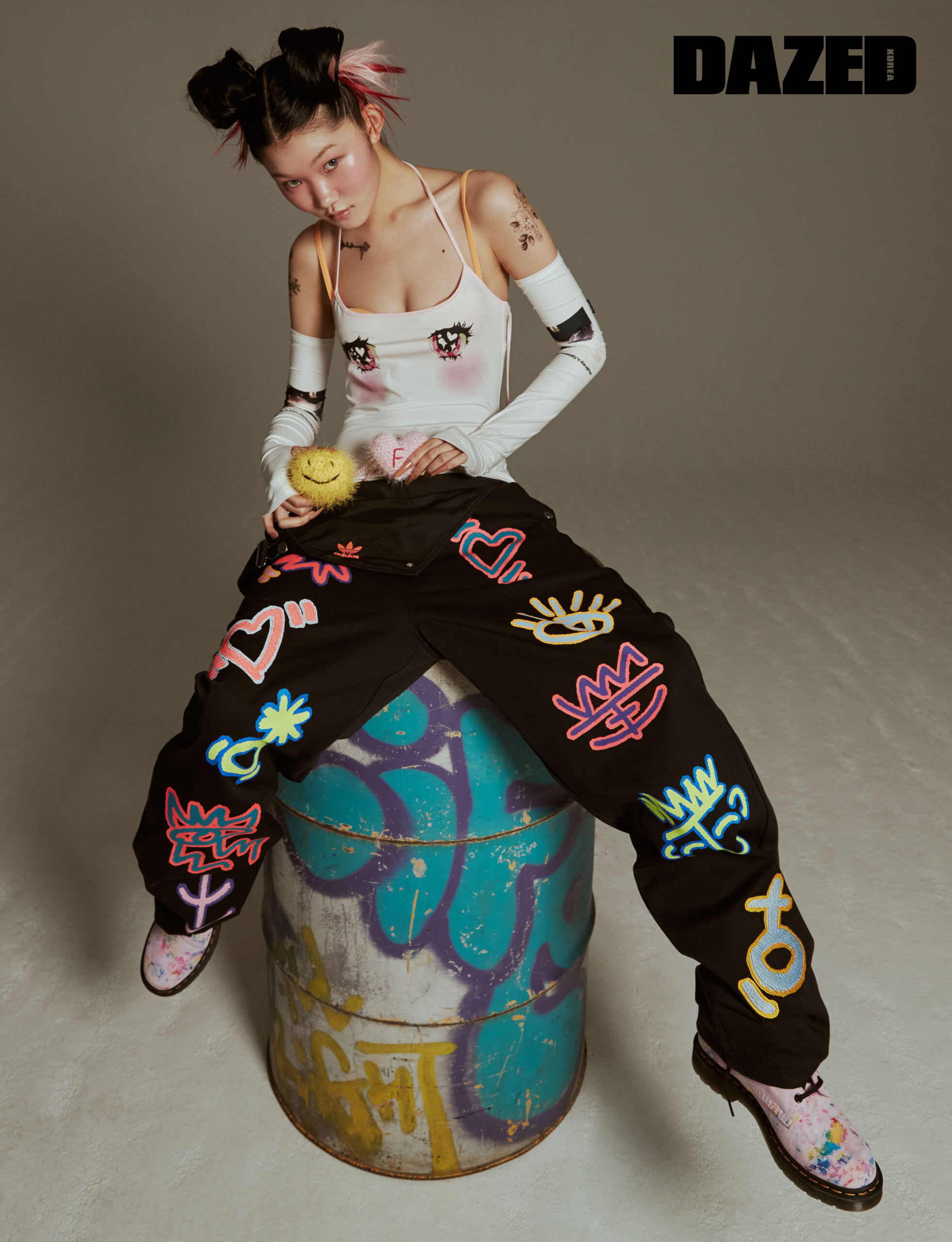 트윙클 아이 프린트 드레스는 노 드레스(No Dress), 이너로 착용한 오렌지 발코넷 브라톱은 에이치앤엠(H&M), 그래픽이 돋보이는 오버올은 아디다스 오리지널스(adidas originals), 프린트 핑크 워커는 닥터마틴(Dr. Martens), 프린트 암 워머는 디와이도샵(Dydoshop), 스마일과 하트 셰이프 크로셰 니트 참은 프루타(Fruta).