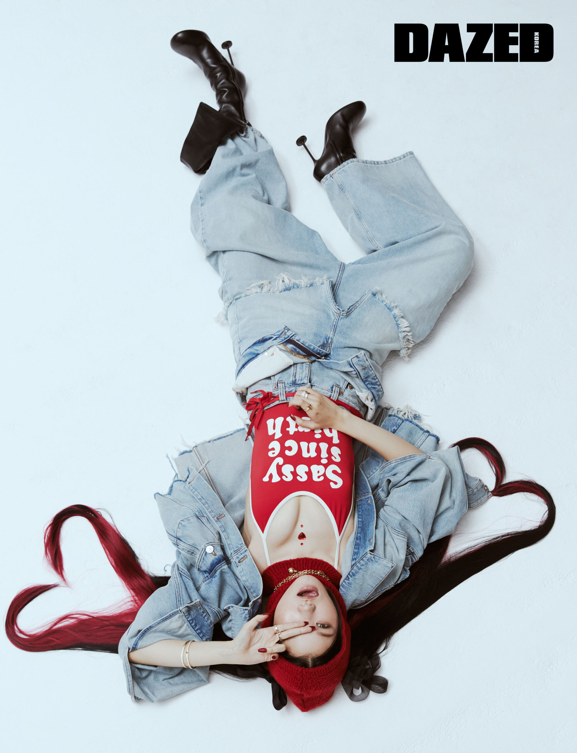 디컨스트럭트 재킷과 데님 팬츠, 레이어링한 데님 미니스커트는 모두 발렌시아가(Balenciaga), 레드 레터링 프린트 스윔슈트는 데이즈 데이즈(Daze Dayz), 티파니 하드웨어 랩 네크리스와 티파니 T1 와이드 풀 다이아몬드 힌지드 뱅글, 티파니 T1 와이드 하프 다이아몬드 힌지드 뱅글, 티파니 T1 화이트 골드 와이드 풀 다이아몬드 링, 티파니 T1 로즈 골드 와이드 하프 다이아몬드 링, 티파니 T1 옐로 골드 와이드 하프 다이아몬드 링, 티파니 T1 화이트 골드 와이드 하프 다이아몬드 링, 티파니 T 트루 파베 와이드 링, 티파니 T 투 링은 모두 티파니(Tiffany & Co.), 발라클라바와 웨이스트 스트랩은 에디터의 것.