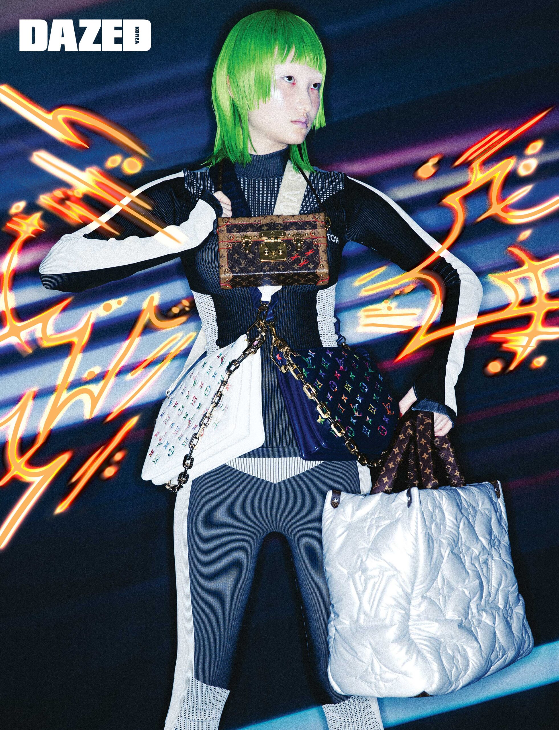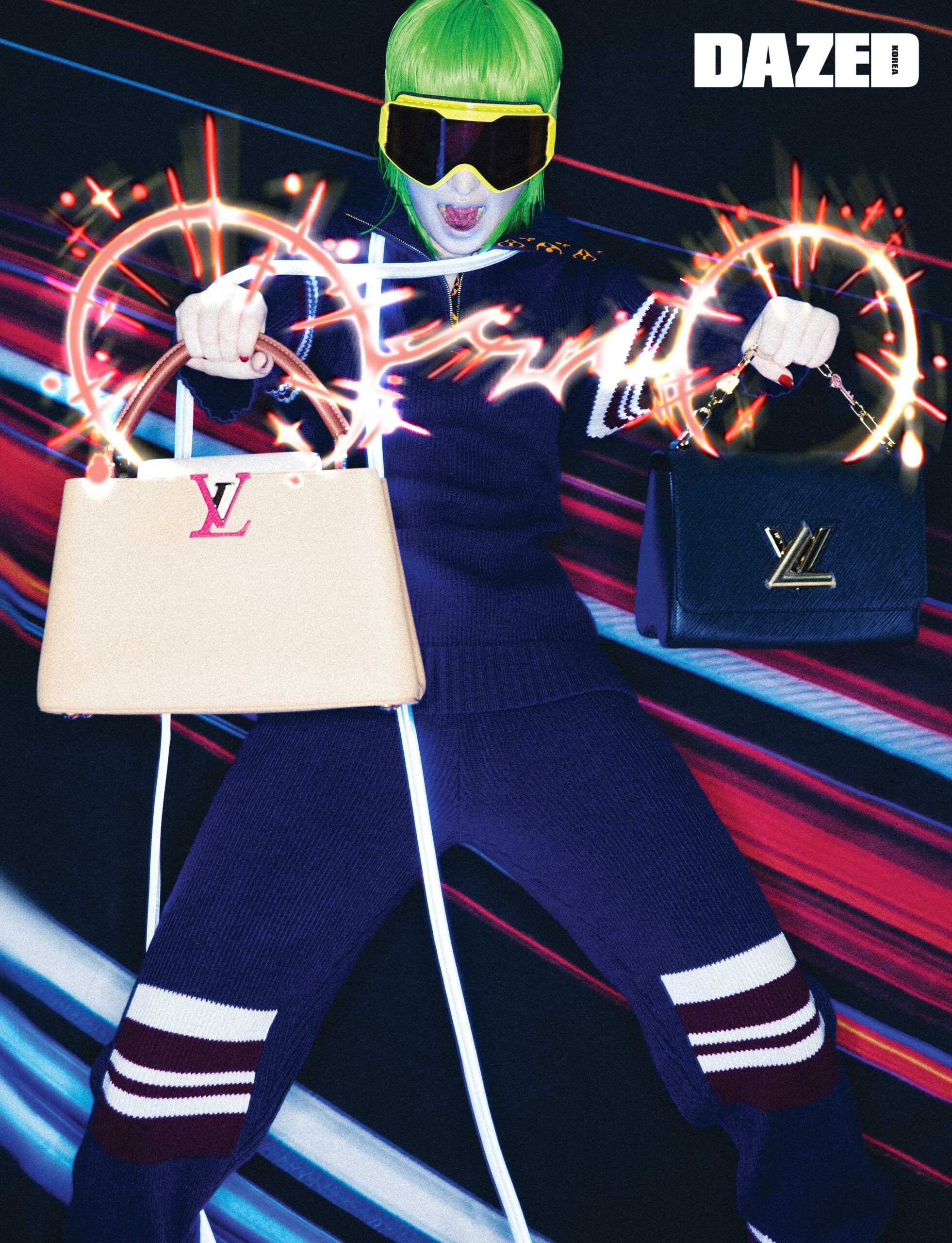 스트라이프 디테일 리브드 터틀넥 풀오버와 조깅 팬츠 셋업, LV 스노우 스키 고글, 오른손에 들고 있는 카퓌신 핸드백, 왼손에 들고 있는 블랙 컬러 트위스트 MM 핸드백은 모두 루이 비통(Louis Vuitton).