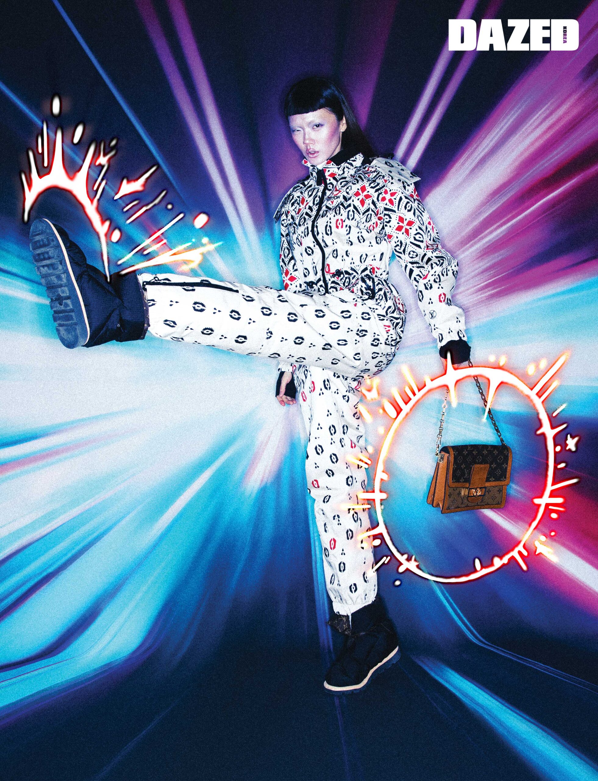 LV 스노우 후디드 스키 슈트와 LV 필로우 부츠, 체인 스트랩과 자석형 잠금장치 디테일의 도핀 MM 핸드백은 모두 루이 비통(Louis Vuitton).