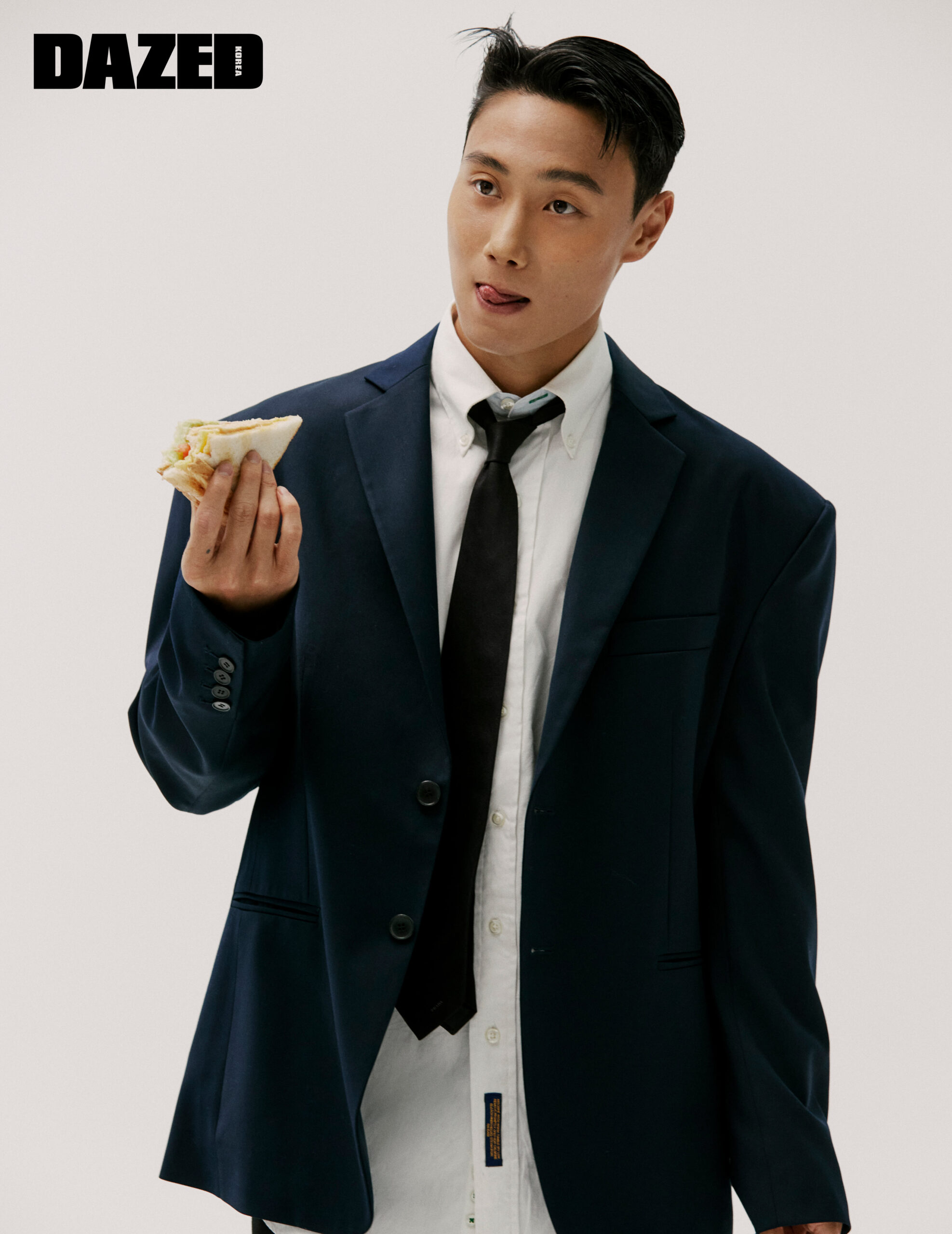 네이비 재킷은 지민리(Jiminlee), 셔츠와 타이는 디렉터의 것.