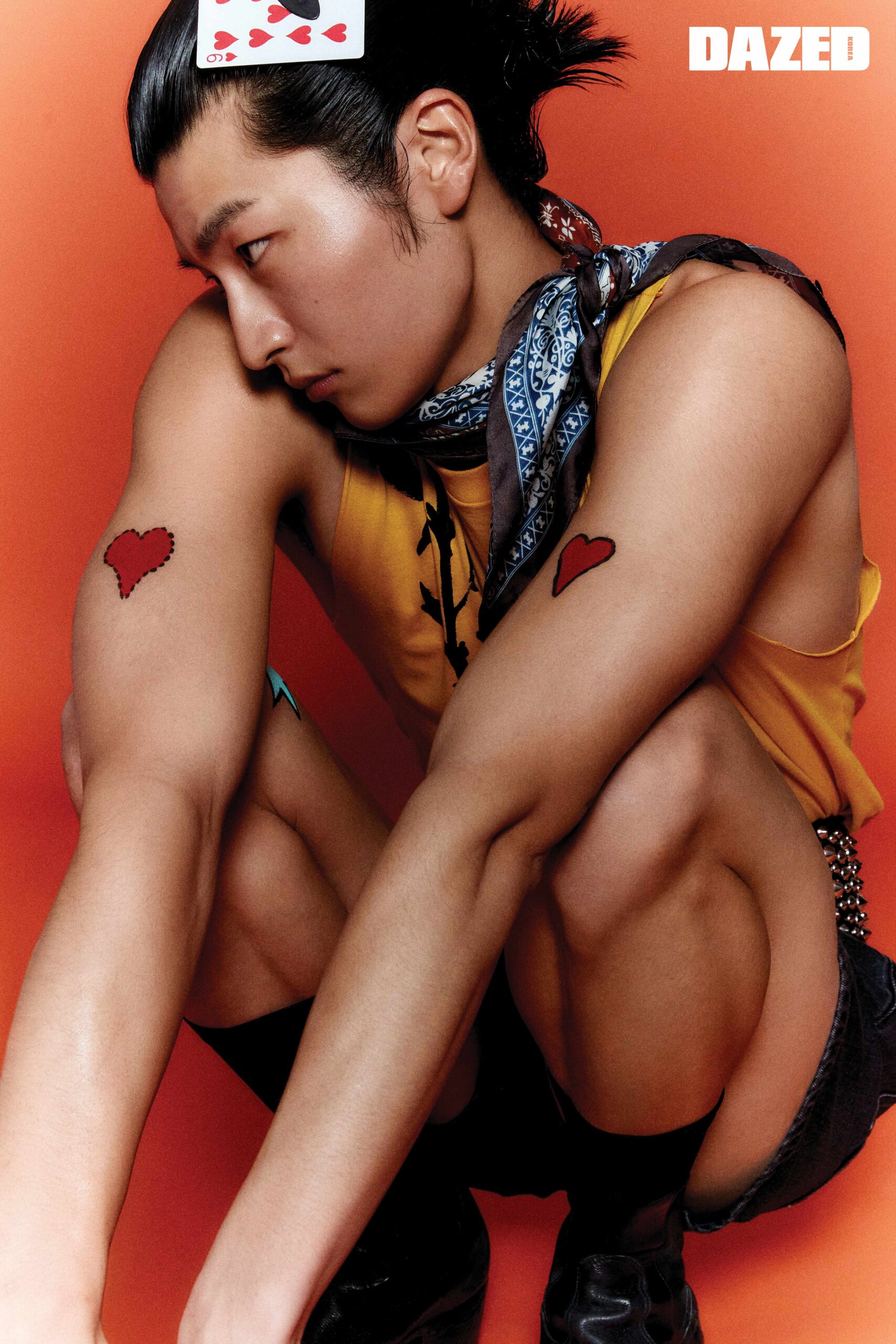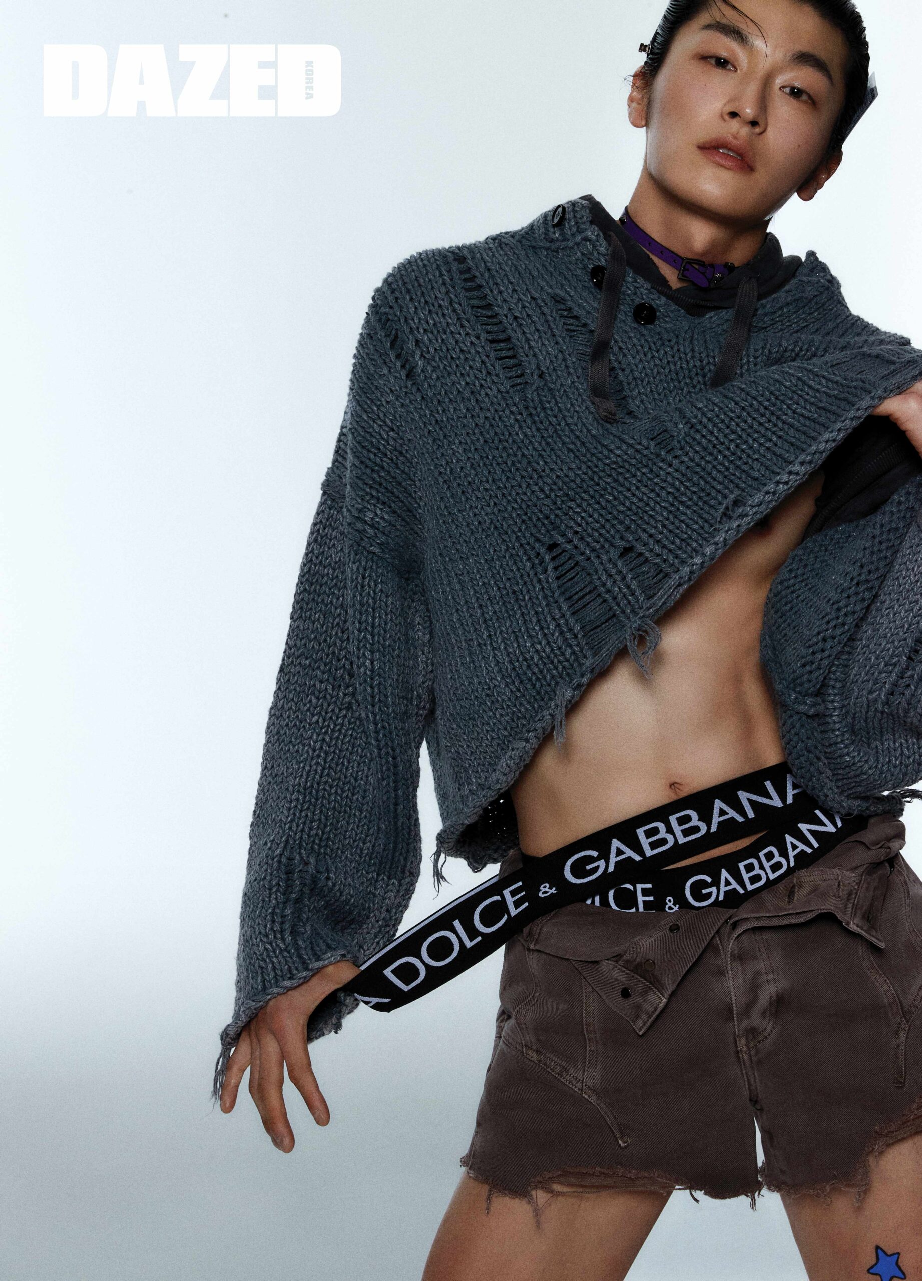 크롭트 스웨트셔츠와 디스트로이드 후드 톱, 더블 밴드 브리프는 모두 돌체앤가바나(Dolce&Gabbana), 쇼츠는 와이씨에이치(YCH), 레더 초커는 베르사체(Versace).