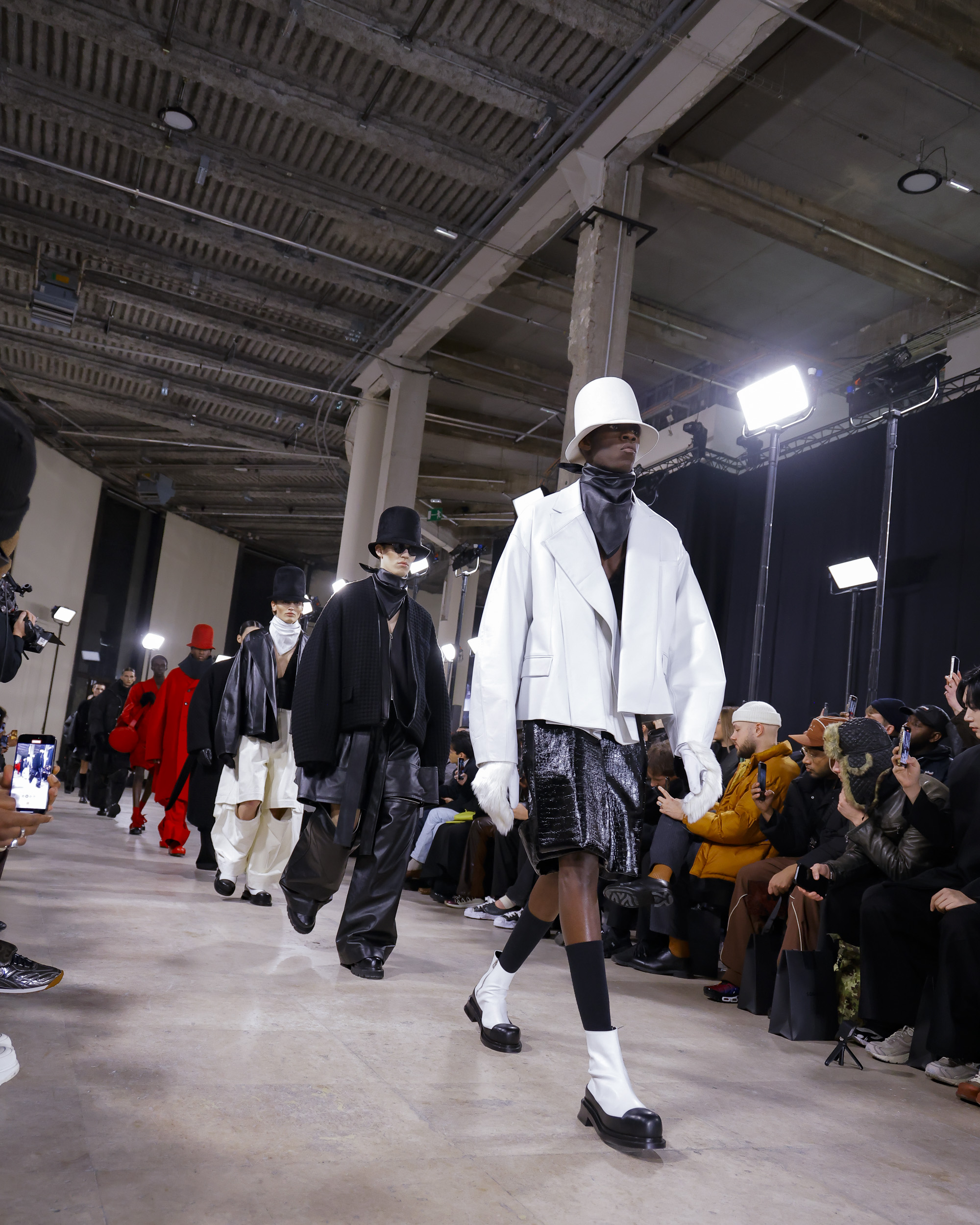 유난히 바람이 거세게 불던 19일 파리의 밤, 송지오는 팔레 드 도쿄에서 2024년 F/W 컬렉션을 선보였다. 컬렉션 테마는 송지오의 안티 히어로인 밤의 도둑들을 그려낸 ‘NIGHT THIEVES’. 이번 컬렉션은 프로메테우스를 묘사하는 그림에서 시작되었다. 인간에게 불을 내어준 죄로 천벌을 받은 프로메테우스처럼, 반영웅적인 캐릭터를 송지오만의 동양적인 실루엣과 곡선을 활용한 우아한 실루엣으로 입체적으로 묘사했다. 그리고 울, 실크, 테크니컬 코튼, 오간자 등 다양한 소재를 활용해 전위적인 실루엣을 구현했다. 송지오의 아방가르드한 디자인과 리복의 역동적인 에너지가 결합해 탄생한 슈즈는 컬렉션의 완성도를 높였다. 쇼가 끝나고 더욱 캄캄해진 밤, 호텔로 돌아가는 걸음에 남은 송지오라는 여운이 남았다. 밤의 도둑이 된 것만 같은 낯설고 흥분되는 기분.