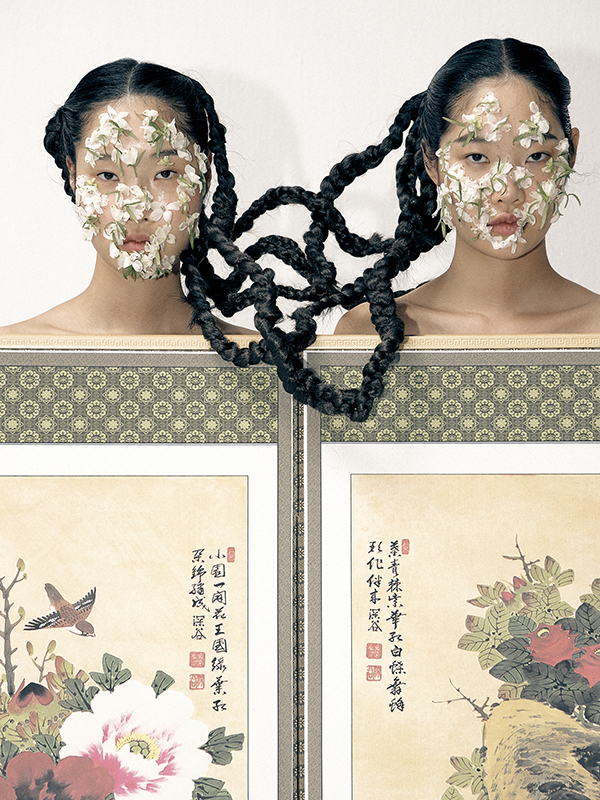 프린트 후드 집업은 투머치택스(Toomuchtax), 목에 두른 토슈즈는 레페토(Repetto), 헤드피스는 큐밀리너리(Q Millinery).