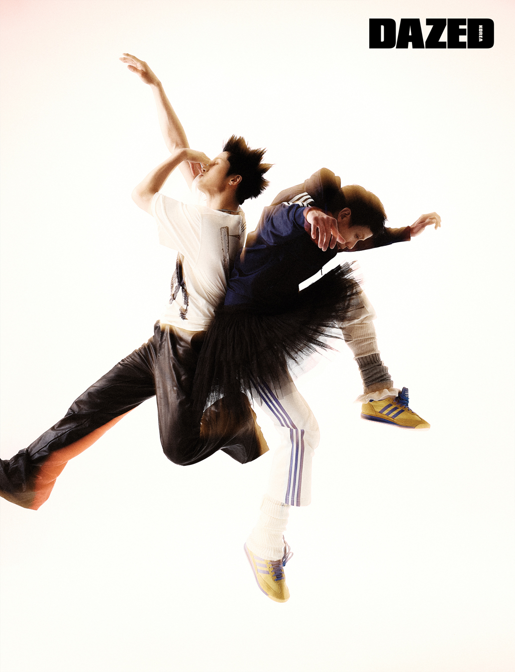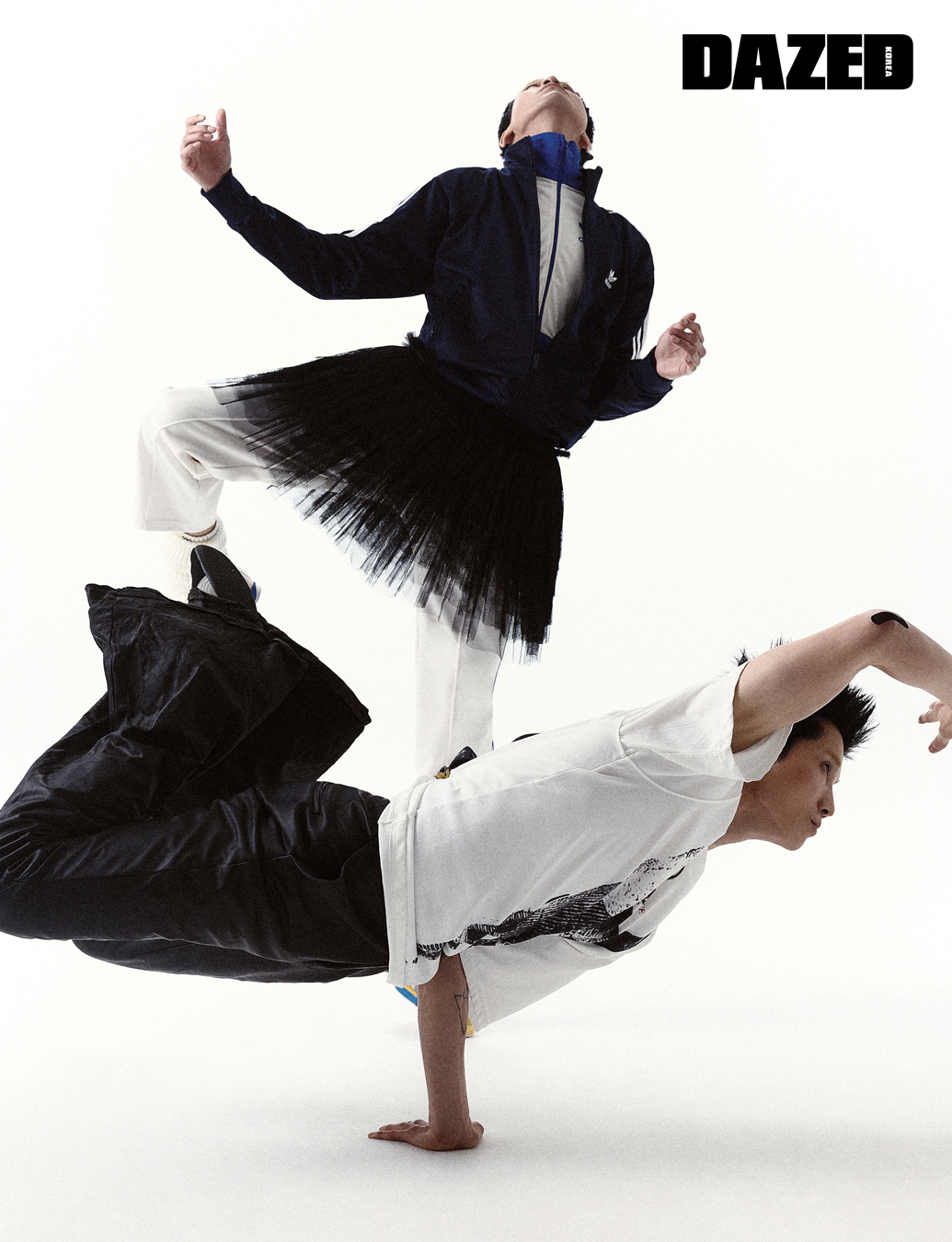 혁진이 입은 네이비 트랙 재킷과 화이트 트랙 재킷, 트랙 팬츠, 스니커즈는 모두 아디다스 오리지널스(adidas Originals), 튀튀와 화이트 레그 워머는 에디터의 것. 헌우가 입은 프린트 티셔츠는 604서비스(604service), 레더 팬츠는 릭 오웬스(Rick Owens), 스니커즈는 푸마(Puma).