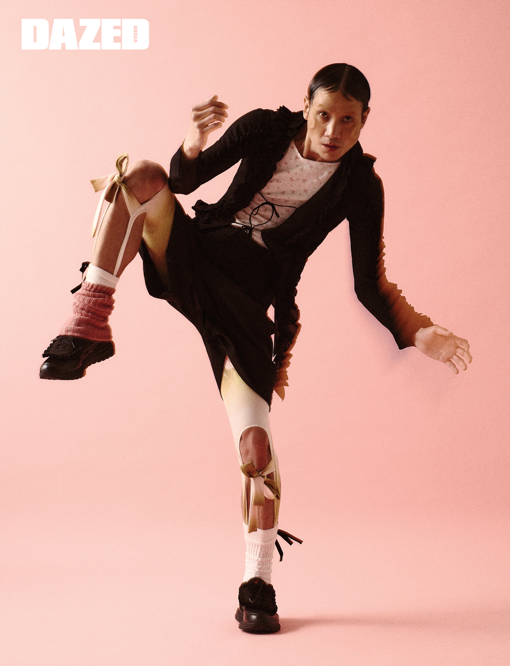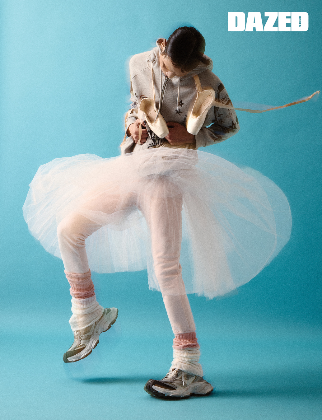 프린트 후드 집업은 투머치택스(Toomuchtax), 화이트 롱 튀튀와 슬림 조거 팬츠, 목에 두른 토슈즈, 핑크 레그 워머는 모두 레페토(Repetto), 스니커즈는 발렌시아가(Balenciaga), 화이트 레그 워머는 에디터의 것.