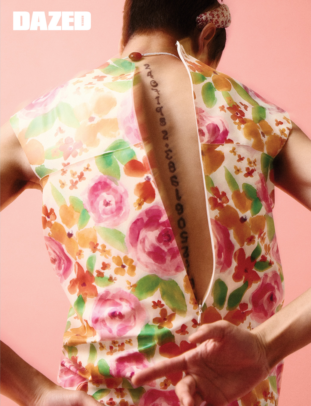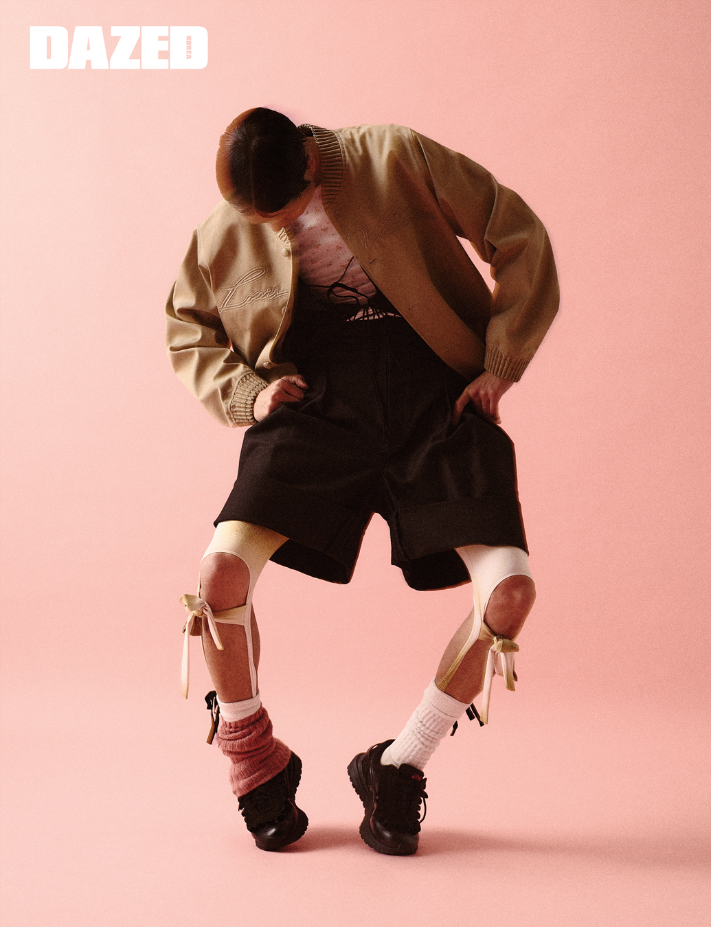 베이스볼 블루종은 루이 비통(Louis Vuitton), 러플 디테일 블랙 블라우스는 에이치앤엠(H&M), 플라워 프린트 톱은 페르트(Pehrt), 버뮤다팬츠와 니삭스는 메종 마르지엘라(Maison Margiela), 플로럴 스트랩 레깅스는 오픈와이와이(OPEN YY), 슈즈는 아식스 스포츠스타일 X 슈슈통(ASICS SportStyle X SHUSHU TONG), 핑크 레그 워머는 레페토(Repetto).