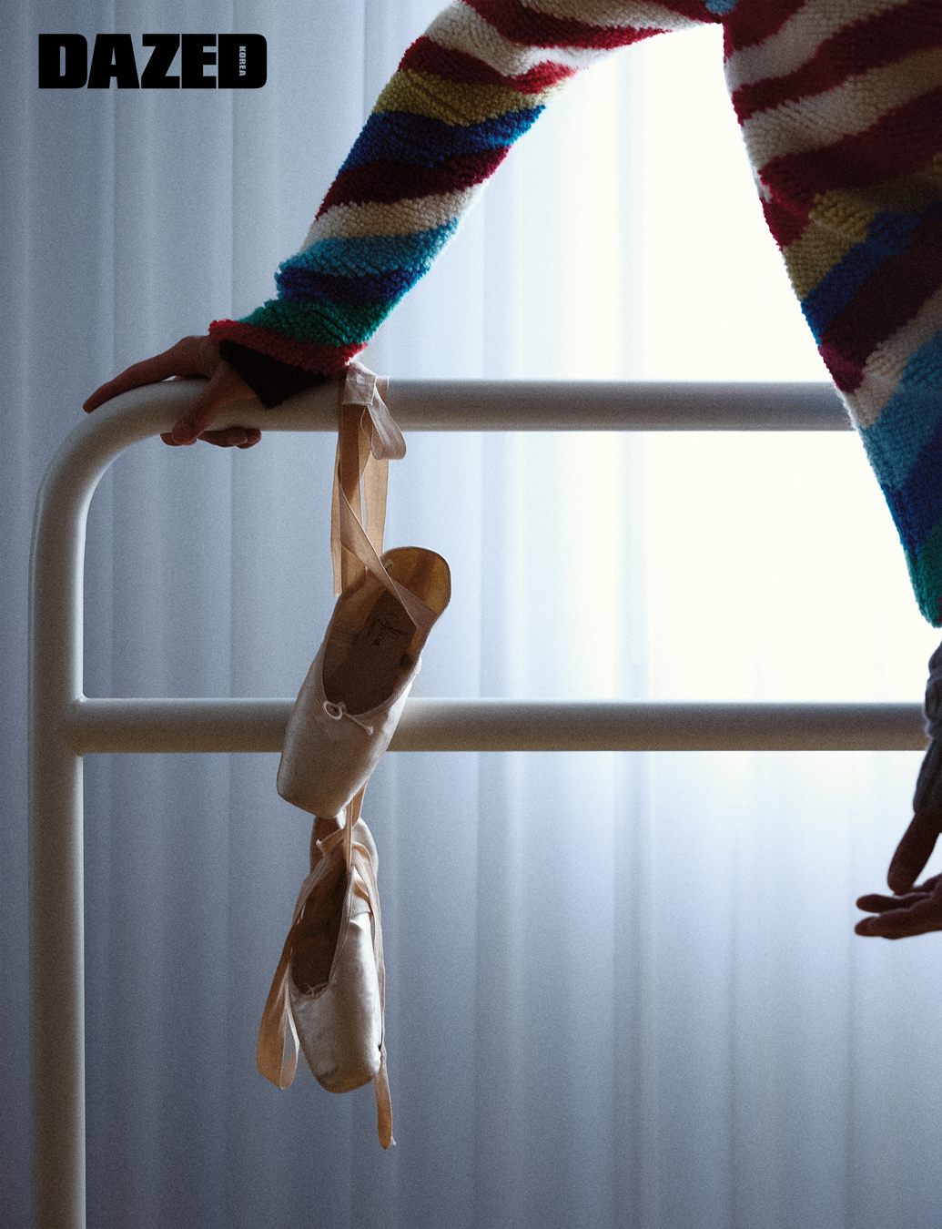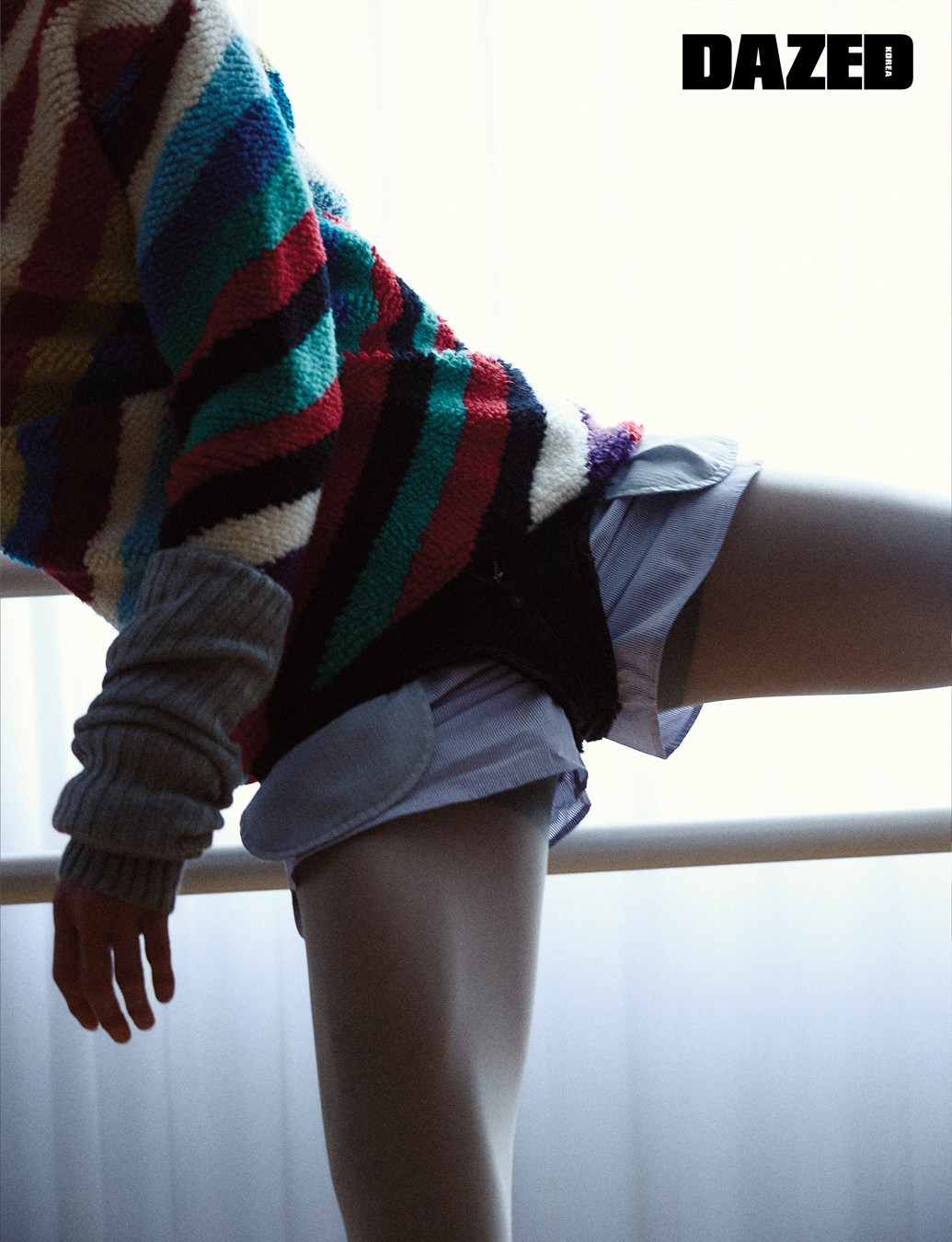 컬러 스트라이프 니트 스웨터는 보테가 베네타(Bottega Veneta), 팬티 레이어링 데님 쇼츠는 푸시 버튼(Push Button), 그레이 핸드 워머와 토슈즈는 레페토(Repetto), 레그 워머와 삭스는 에디터의 것.