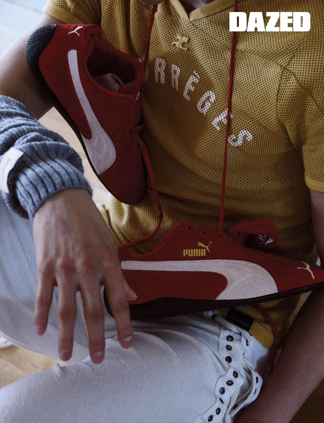 베이스볼 메시 티셔츠는 꾸레쥬(Courrèges), 레이스업 디테일의 스웨트팬츠는 위크 제너레이션(Weak Generation), 그레이 핸드 워머와 레그 워머는 레페토(Repetto), 목에 두른 레드 스니커즈는 푸마(Puma), 화이트 레그 워머, 네크리스, 이어링은 모두 에디터의 것.