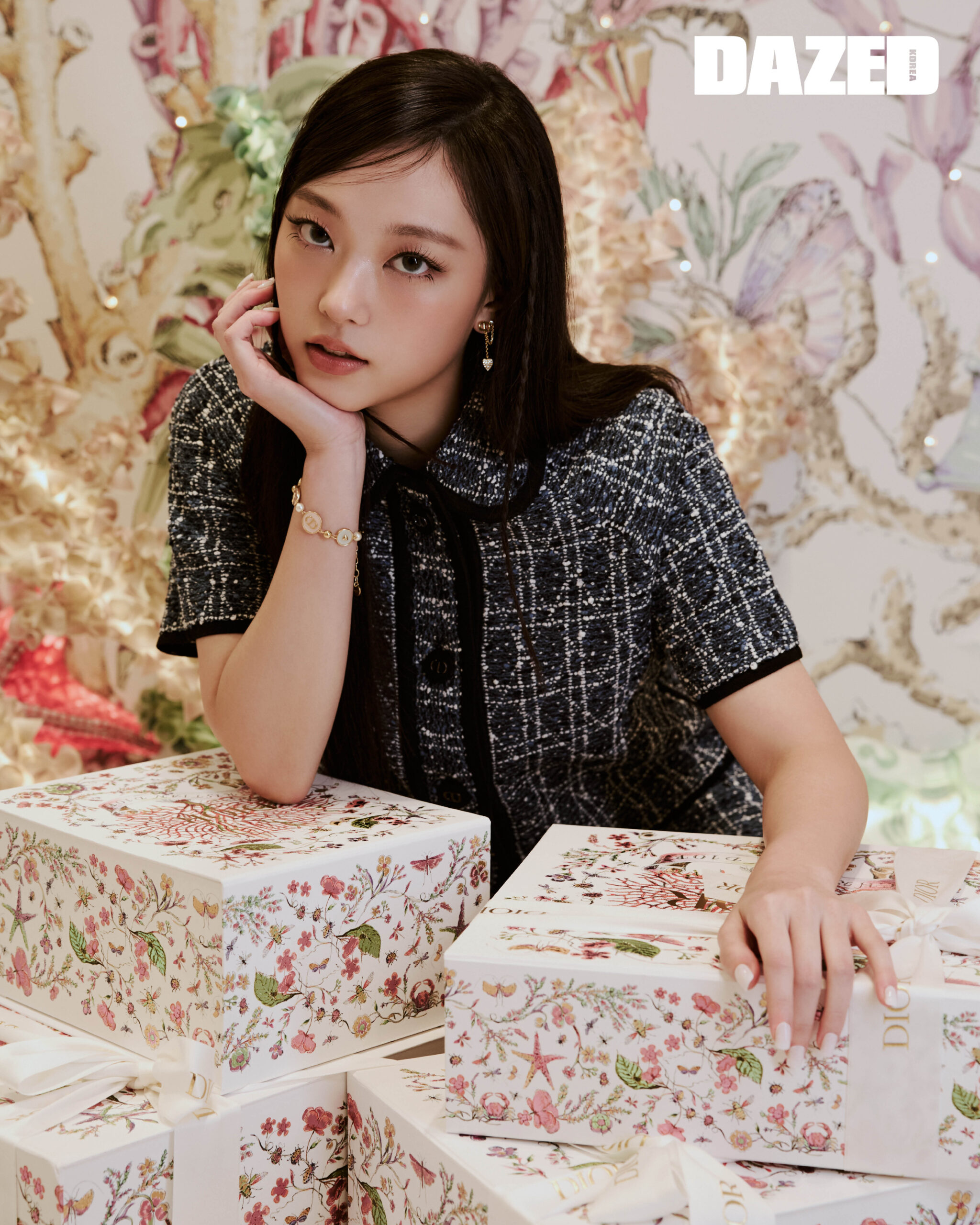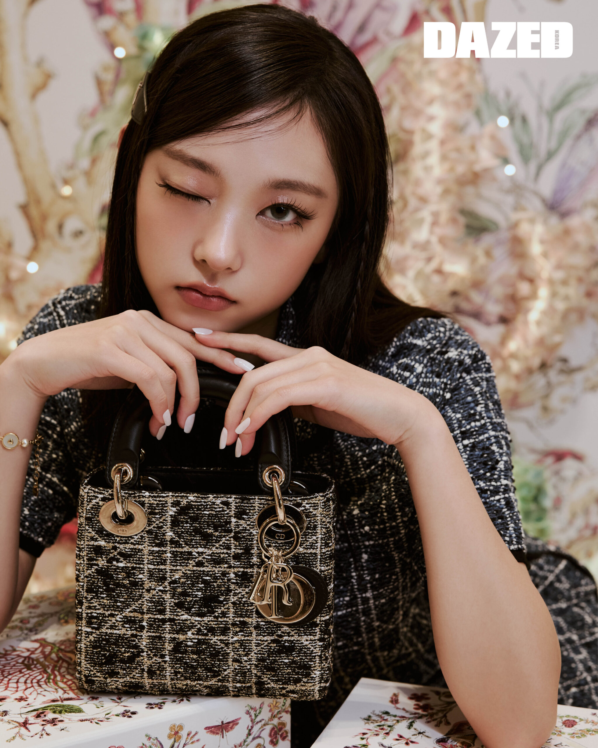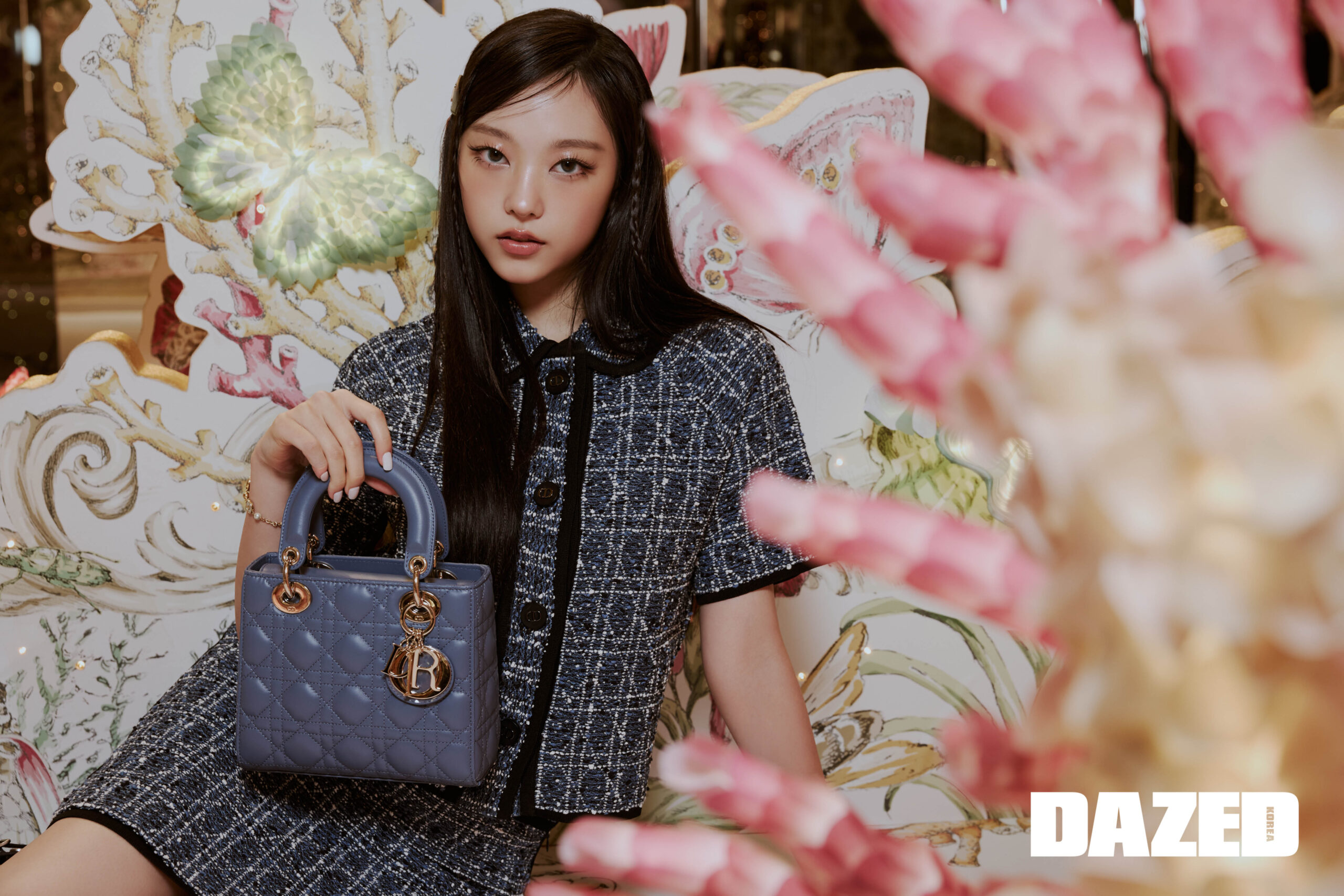 블루 코튼 블렌드 트위드 & 화이트 스레드 까나쥬 하프 슬리브 재킷과 미니스커트 셋업, 블랙 MISS DIOR DIOR IDOL 헤어핀, 골드 피니시 메탈 & 화이트 진주의 멀티 D-Luck 브레이슬릿, 데님 블루 까나쥬 Lady Dior 스몰 백은 모두 디올(DIOR).