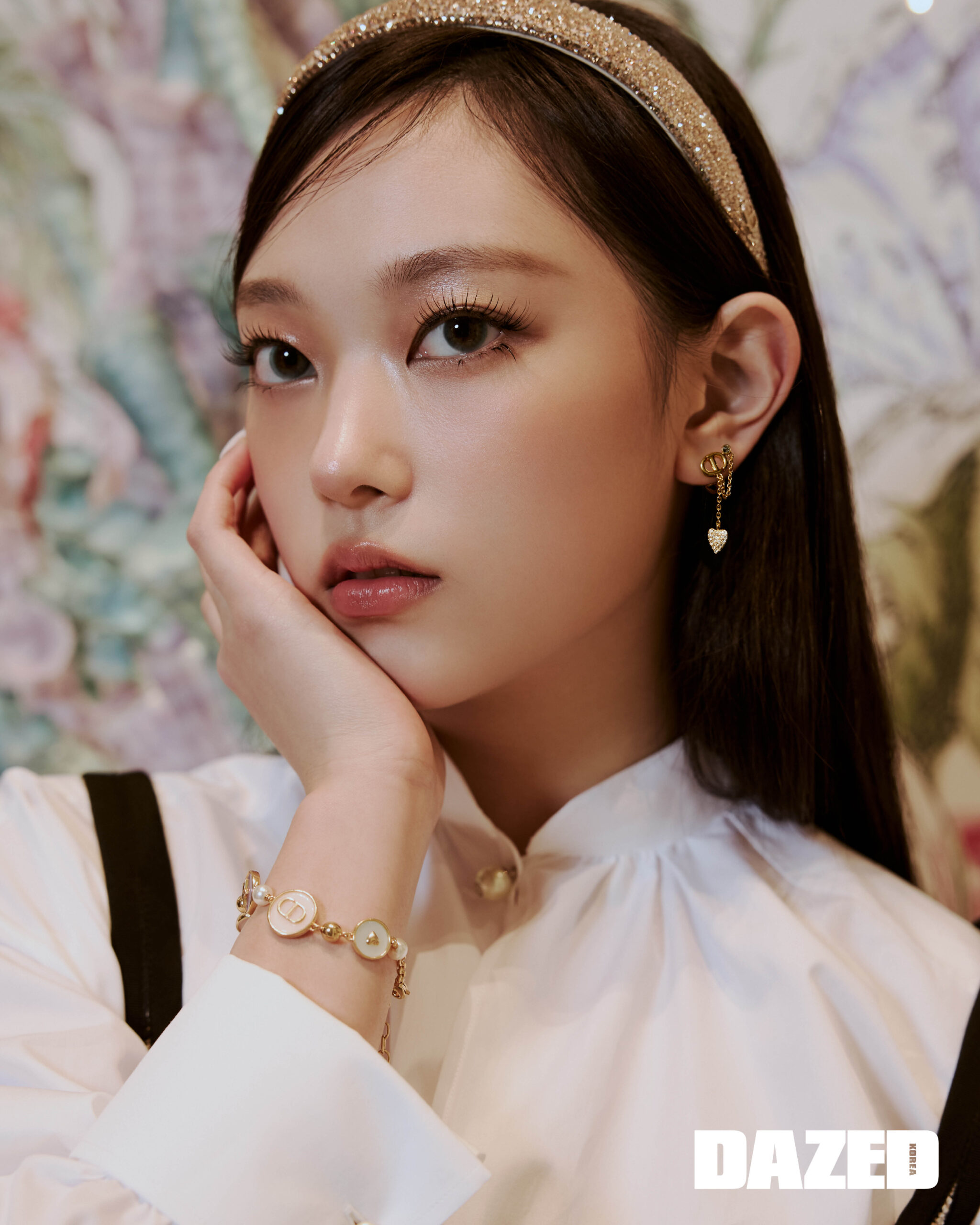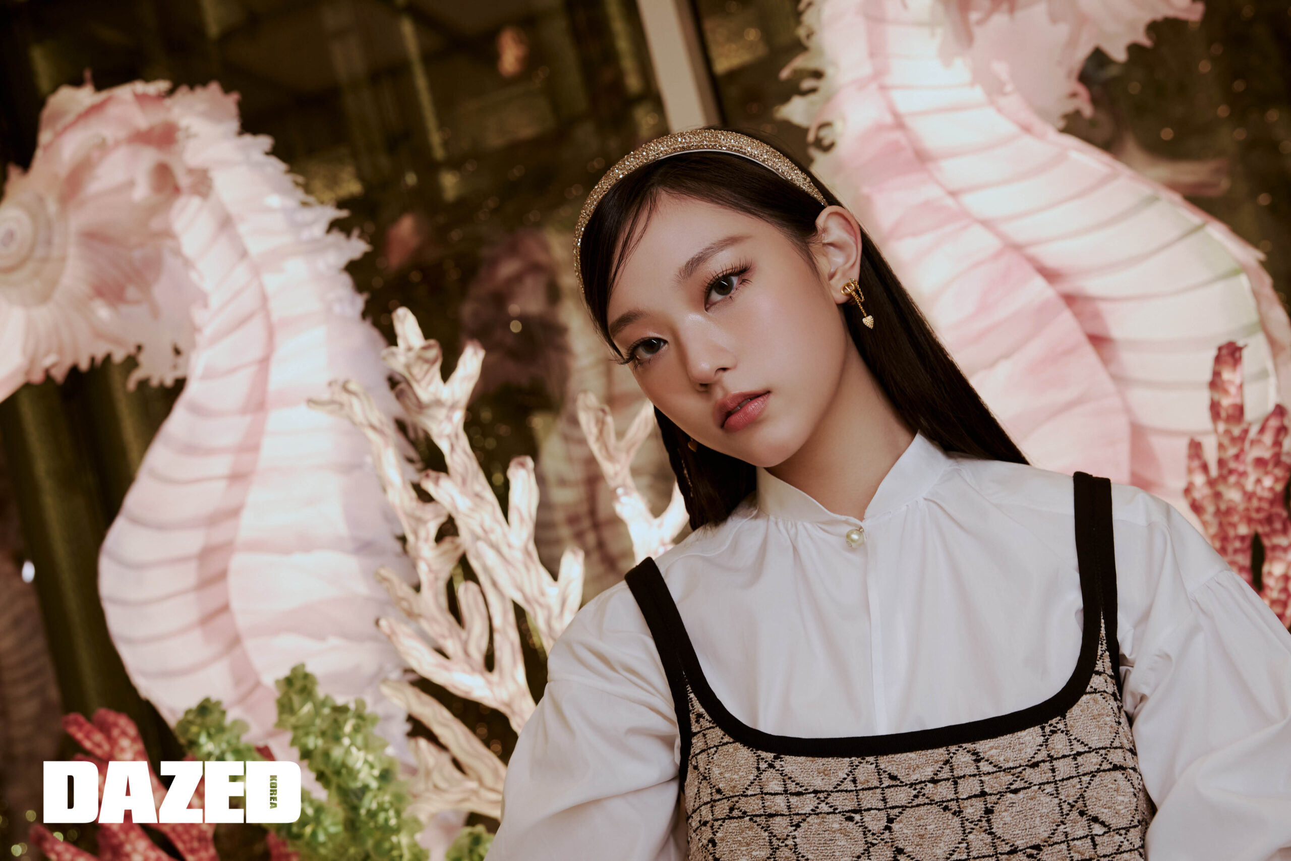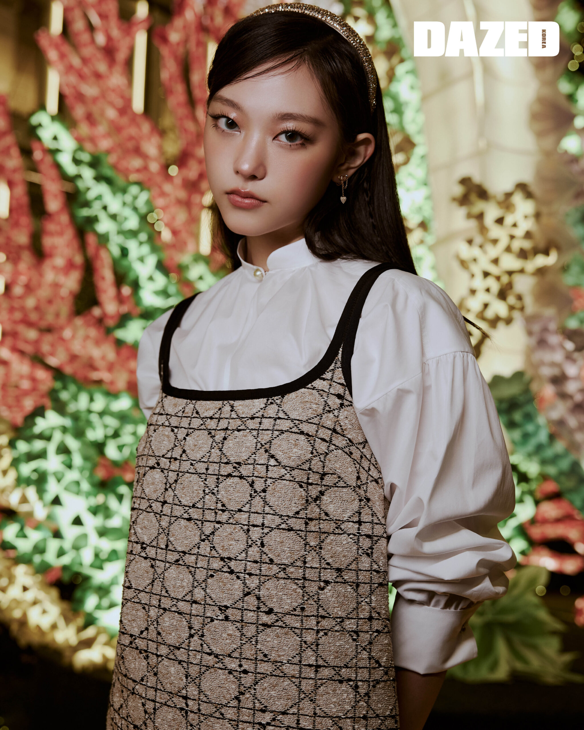 베이지 & 블랙 코튼 블렌드 트위드 쇼트 플레어 까나쥬 드레스와 화이트 코튼 포플린 롱 블라우스, 골드 코튼 블렌드 & 라인스톤 DIOR BAND 헤어밴드, 골드 피니시 메탈 & 실버 톤 크리스탈 CD Navy 이어링은 모두 디올(DIOR).