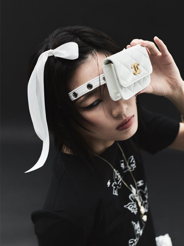화이트 레이스 셔츠와 팬츠는 맥퀸(McQueen), 화이트 로퍼는 셀린느(Celine), 테디베어 키체인 키링은 바퀘라(Vaquera).