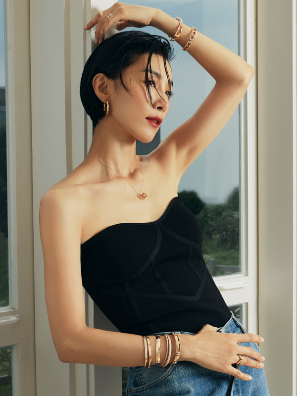 내 인생에 특정한 뮤즈는 없었다. 이번 화보 역시 스타일을 선명하게 보여 줄 수 있는 아이코닉한 인물이 필요했을 뿐이다. 고민 끝에 떠올린 이름은 그레이스 존스. 레더 재킷과 각진 파워 숄더, 중성적이고 강인한 이미지면 충분했다. 하지만 그에게 끌린 이유가 단지 스타일 때문만은 아니다. 어려웠던 과거와 달리 세상 앞에 내놓은 얼굴은 언제나 씩씩하고 초연했으며, 쉽게 순종하지 않는 태도를 지녔기 때문이다. 이 점이 내가 오래도록 선택해 온 페르소나와 닮아 있다고 느꼈다. 단단한 테일러링과 과감한 노출, 장식보다 실루엣을 앞세운 선택은 스스로를 지키는 갑옷처럼 보이기도 하니까. 파워풀한 에너지와 장르를 넘나드는 유연함 역시 지금의 내가 가장 닮고 싶은 태도다.