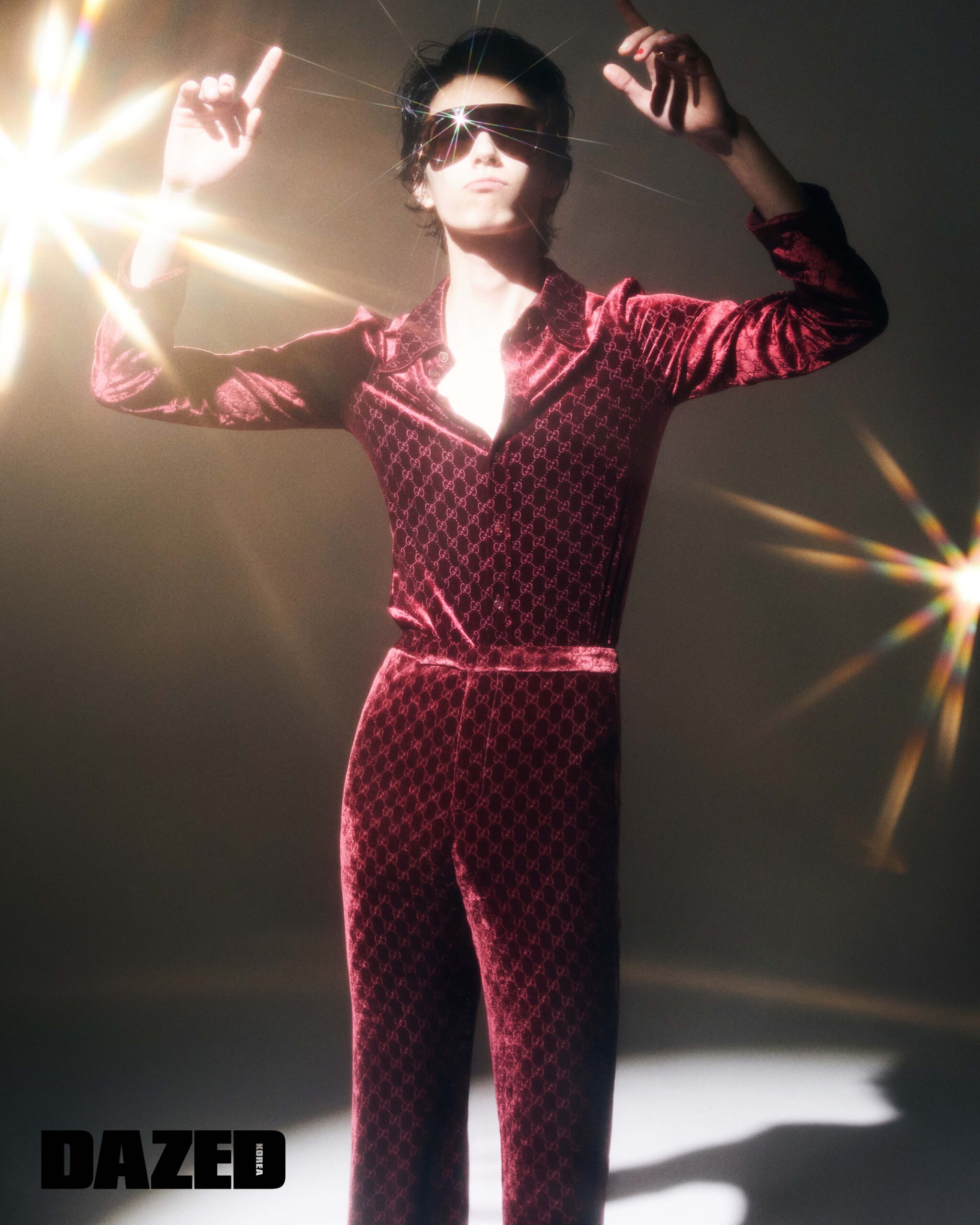 벨벳 셔츠와 팬츠, 선글라스, 링은 모두 구찌(Gucci).