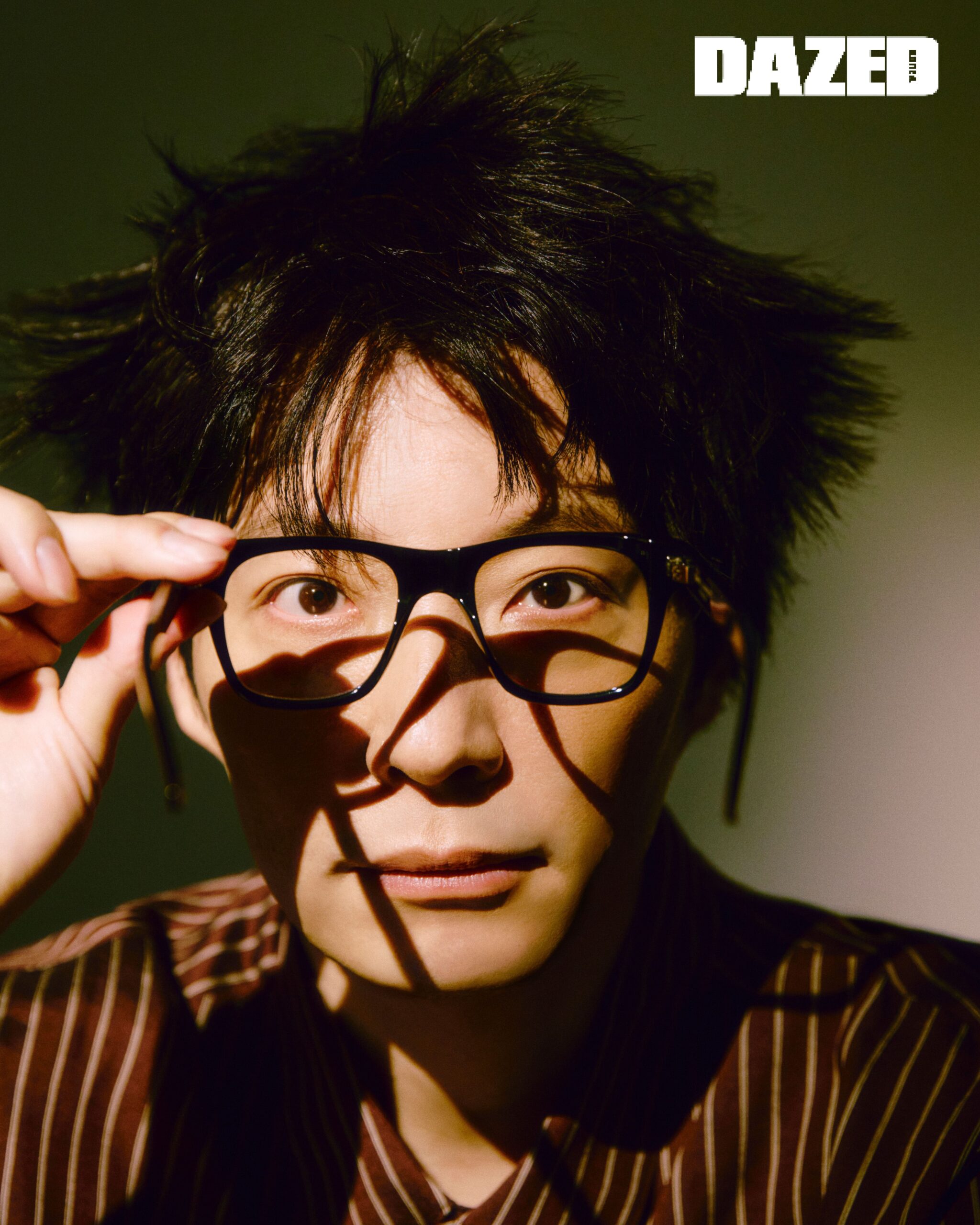스트라이프 셔츠는 렉토(Recto), 아이웨어는 생 로랑 by 안토니 바카렐로(Saint Laurent by Anthony Vaccarello).