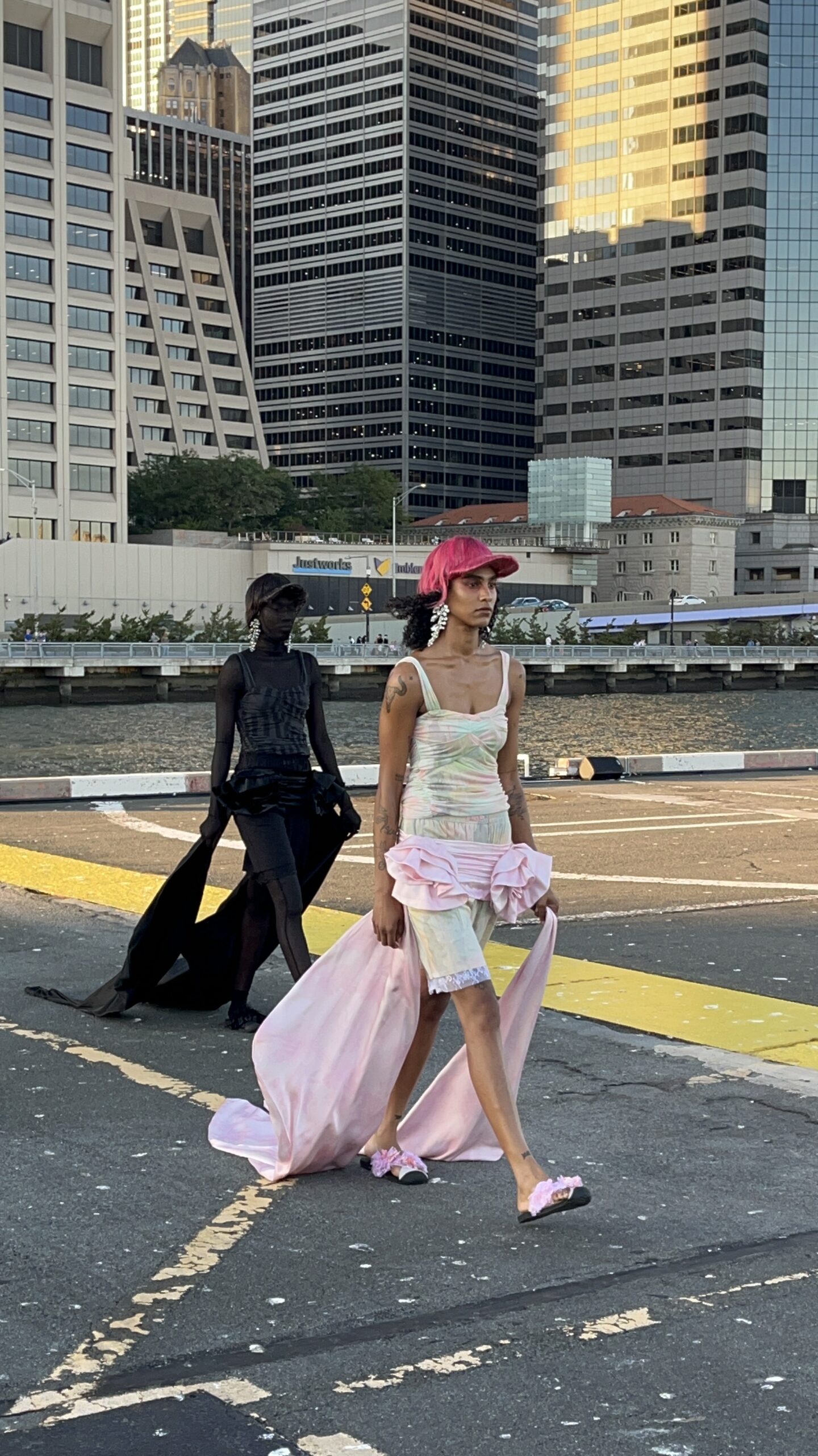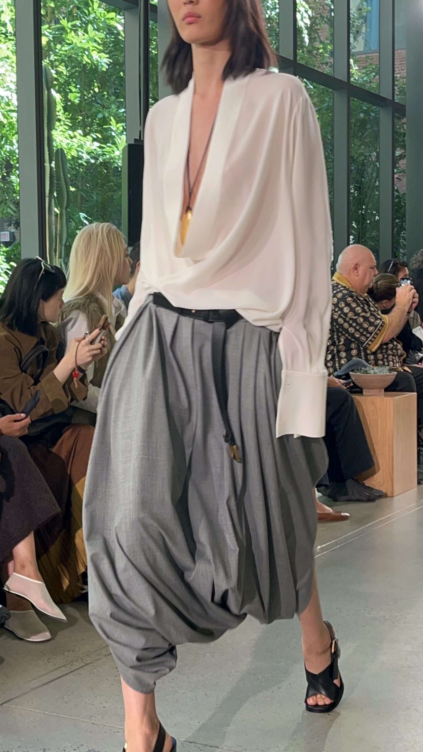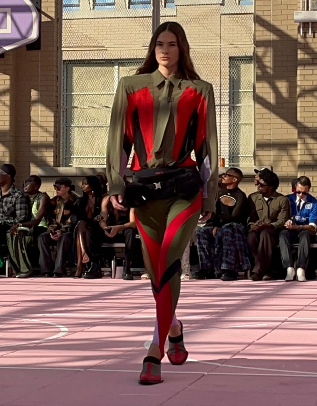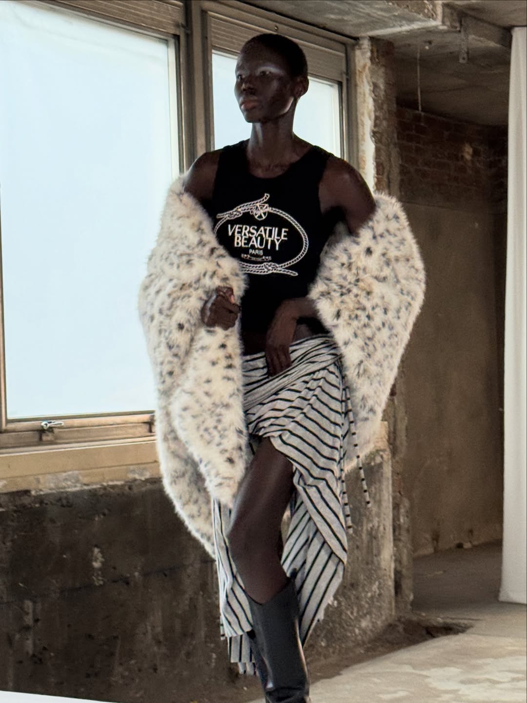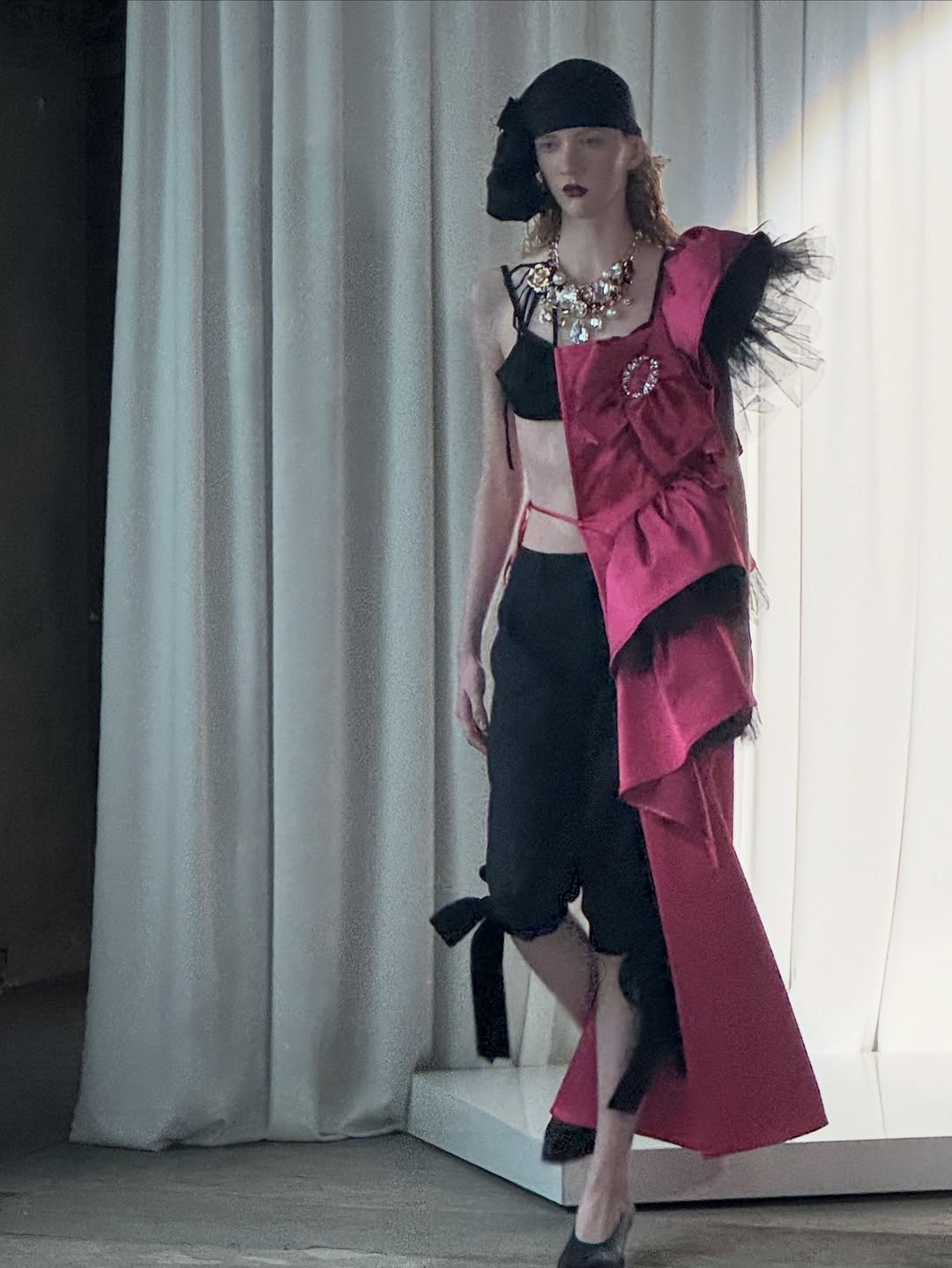 마크 뉴슨이 디자인한 무대는 마치 픽셀화된 로마의 거리처럼 보였다. 낯설면서도 익숙하고, 차갑지만 동시에 따뜻했다. 그 사이를 지나가는 옷들은 한순간 무너질 듯 가볍고, 또렷하게 자기 자리에서 버텼다. 지퍼와 드로스트링이 달린 재킷은 스포츠웨어 같았고, 동시에 밤에 피는 꽃처럼 은밀한 우아함을 가졌다.