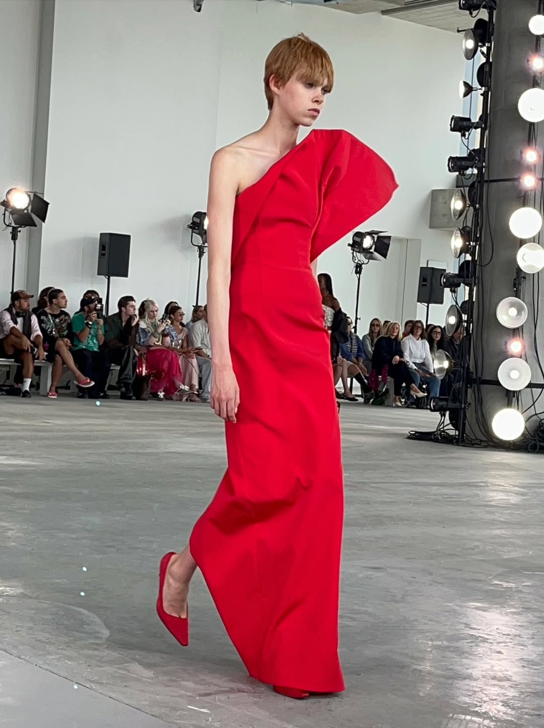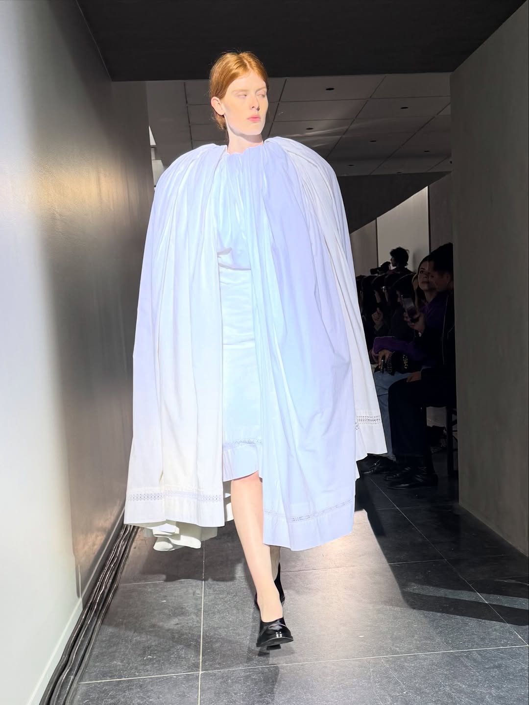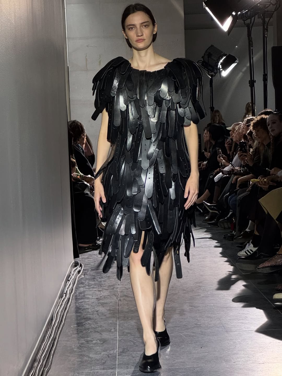 알렉스 콘사니가 런웨이에 오르기 전 룩 체크를 받고 있다. 룩 순서가 정리된 보드를 엿봤다. 모델들의 얼굴과 의상을 번갈아 보며 앞으로 펼쳐질 장면을 그려본다. 전체적으로 보니 클래식 트렌치코트의 다양한 변주가 이번 컬렉션의 중심임을 알 수 있었다. 힙 라인을 따라 흐르는 풍성한 장식, 수백 장의 조각을 접어 완성한 꽃잎 같은 오간자 스커트, 홀터넥 드레스로 변모한 트렌치코트 등. 거의 모든 룩에는 엘라스틱 벨트와 하네스 형태의 스트랩이 더해져 실루엣을 또렷하게 완성한다. 긴장감이 고조된다. 이제 쇼가 시작된다.